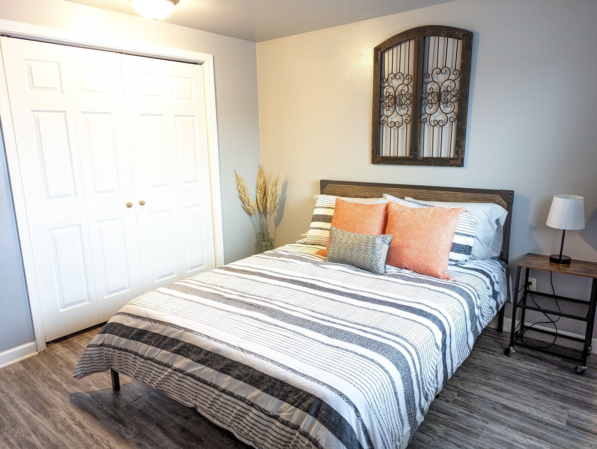 At Ritchie Village’s Pink Flamingo, duplex 15, we packed every possible upgrade into this modest space. New deep tub with marble tile surround, king bedroom set, leather couch, granite countertops, 65 inch modern electric fireplace and 65 inch smart Roku TV. Private garage entry and in unit laundry. Extra fridge in garage for more space. Brought to you by Appleton Corporate Housing with 16 of these duplexes and 40+ furnished housing options in Northeast Wisconsin.