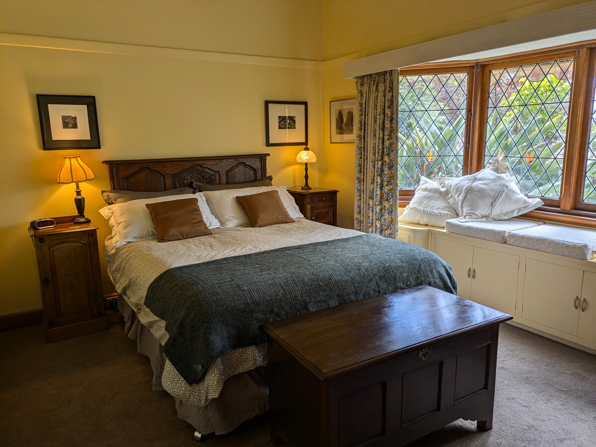 The Gables is a charming two storey house with three bedrooms, one large one downstairs and two small attic bedrooms. It has a renovated kitchen, living and dining room, poolroom, sunroom, and a full bathroom downstairs and a small study/ dressing room and a second toilet upstairs. Built in the 1930s in the picturesque style, heavily influenced by the Arts and Crafts movement, the rooms are styled with antique items that are beautiful but not precious.