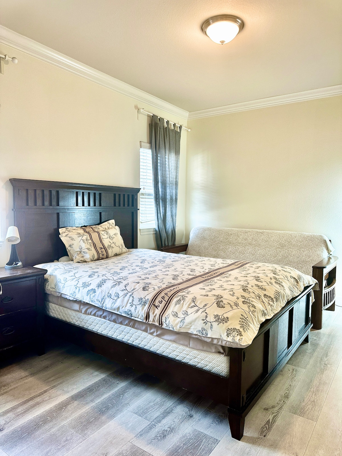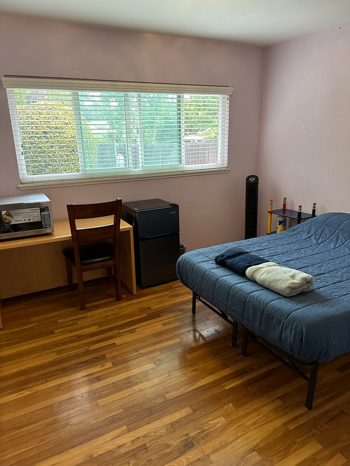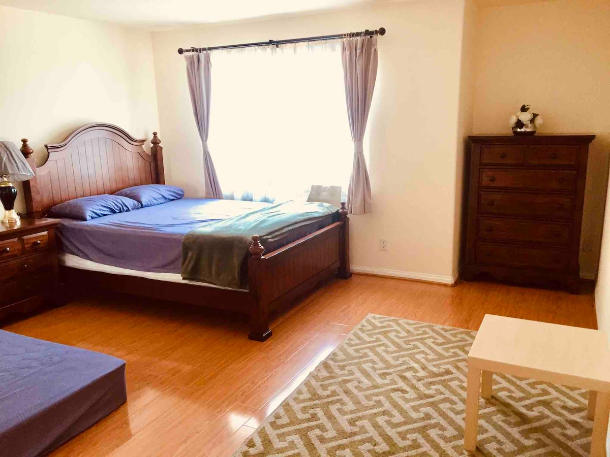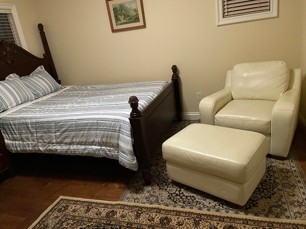 A private room, with a private bath and a separate dressing area awaits you. A queen size mattress, bed awaits you. We have a lounging and a study chair with a pull out table, chest of drawers and ample space for all your books and clothes. We have a night stand with drawers and a table lamp. There is a ceiling fan with lights. We have central air and heating. There is also an air purifier and a humidifier and an extra fan and heater lying in your closet if you should need it. Bathroom is supplied with towels and hair dryer liquid soap and lotion. If you are here for a short stay we will supply amenities such as shampoo, conditioner and body wash also.