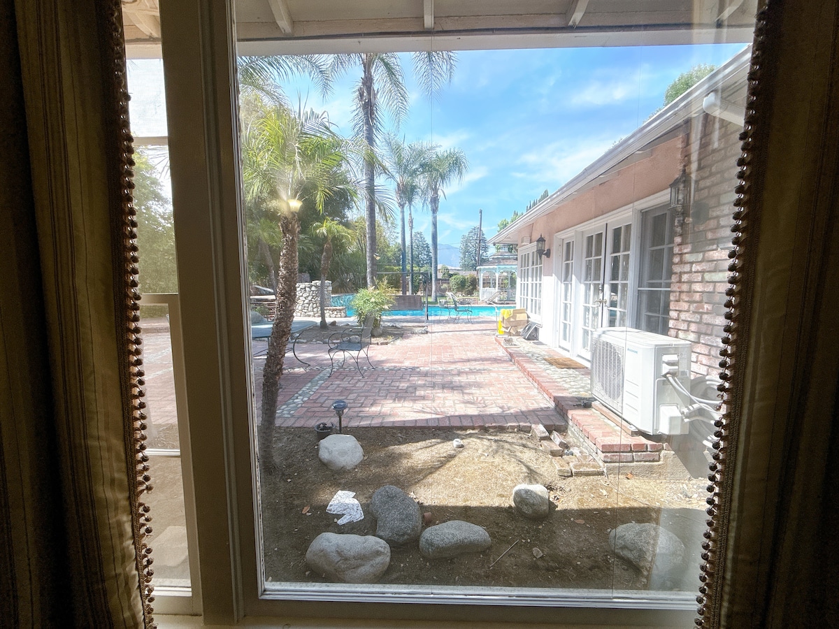 This villa is located at the foot of the scenic SAN GABRIEL foothills. The villa covers an area of 40,000 square feet, with a wide lawn and a sparkling swimming pool. It is very private, completely isolated from other houses, has a separate entrance iron gate and a separate exit iron gate, a huge 3-car garage, and can park arbitrarily in the yard, which can accommodate more than a dozen cars. The house consists of a front house and a back house, the front house is 4 bedrooms and the back room is a bedroom. In addition to bringing you a comfortable accommodation experience, this villa is also suitable for banquets, events and parties, and the price is calculated separately.