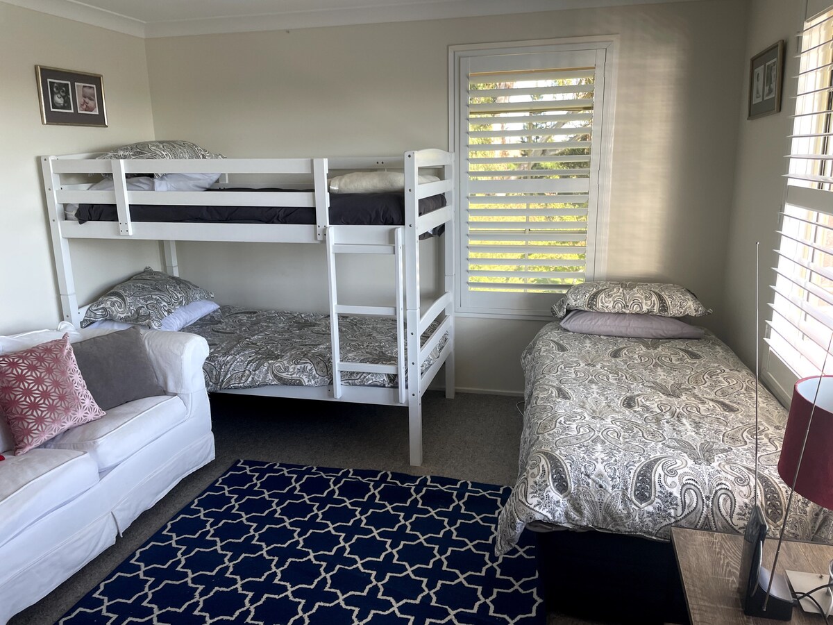 3 bedroom home. 2 guest rooms; 1 Queen bedroom, 1 twin bedroom with 2 x King single beds.
