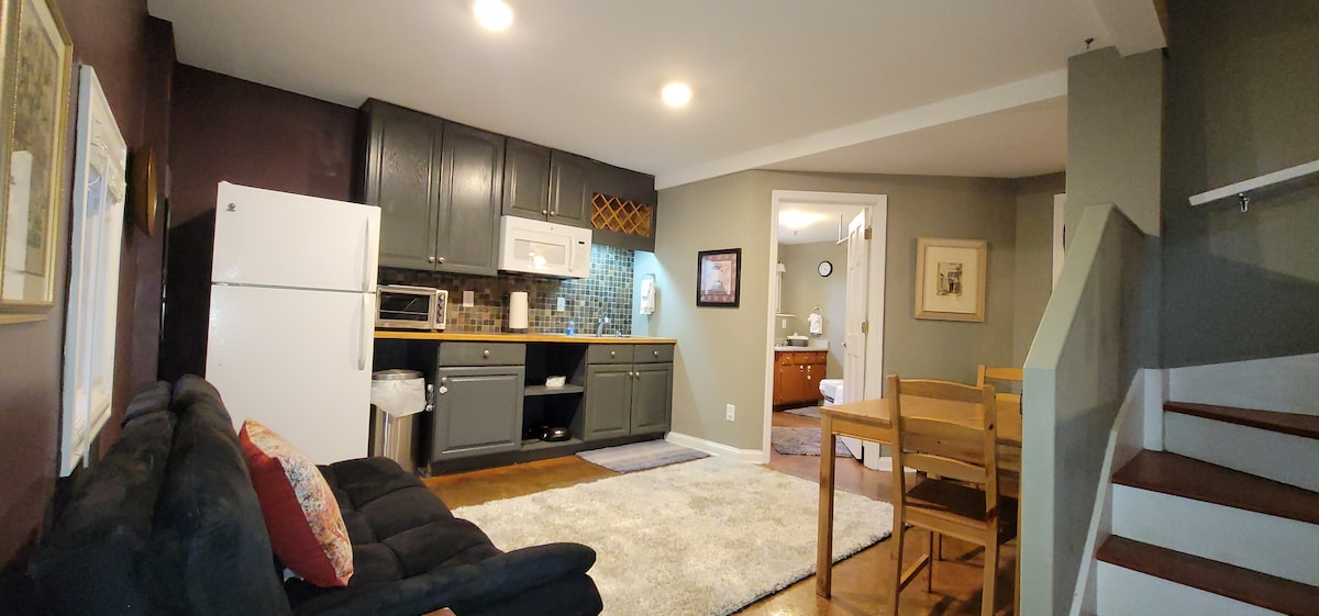 Queen bed, (linens provided) desk, chest, Bathroom, shower. Sitting area with loveseat and TV set for streaming. Kitchenette has small fridge, microwave, toaster oven, coffee maker. Dishes provided.