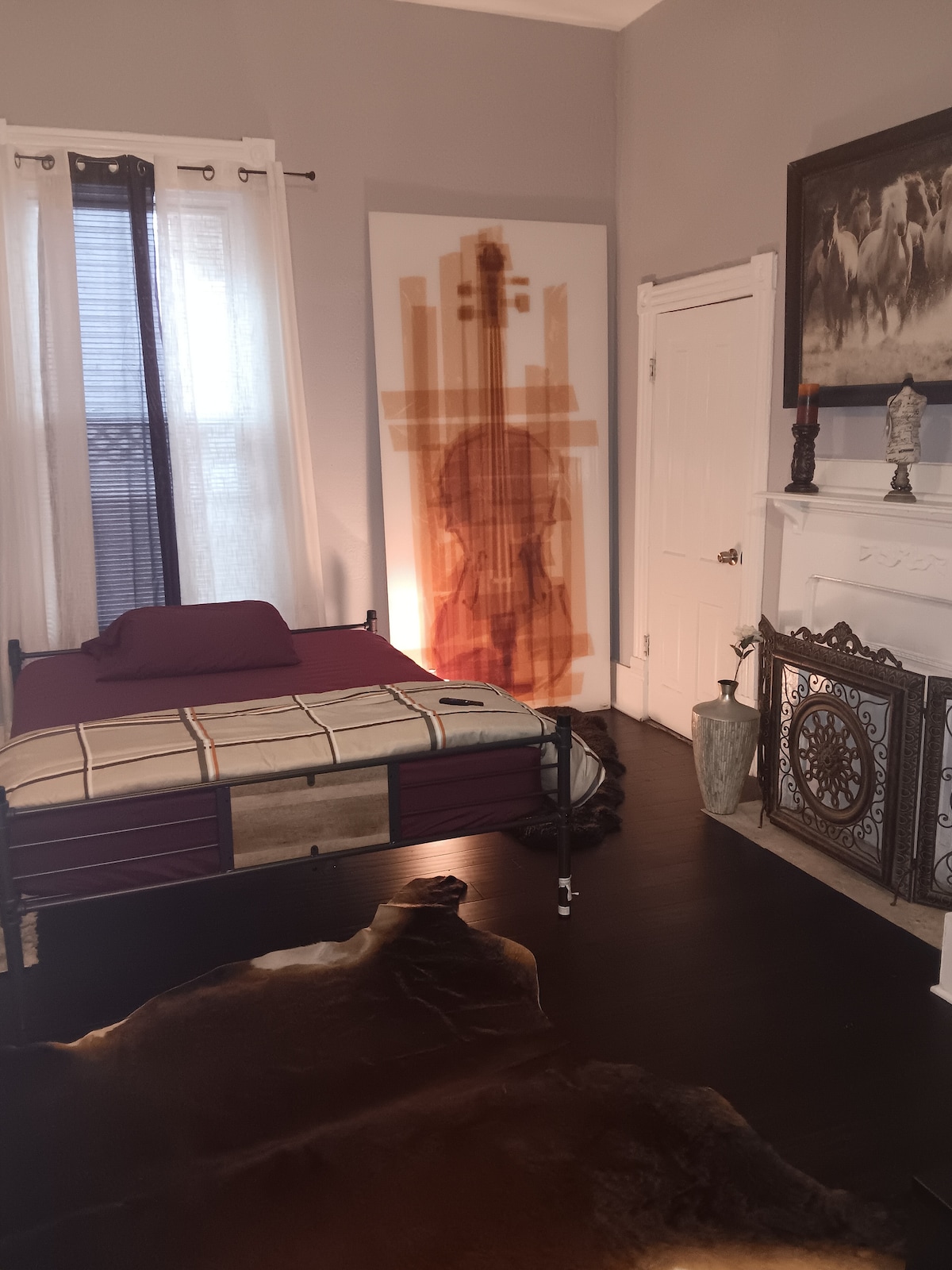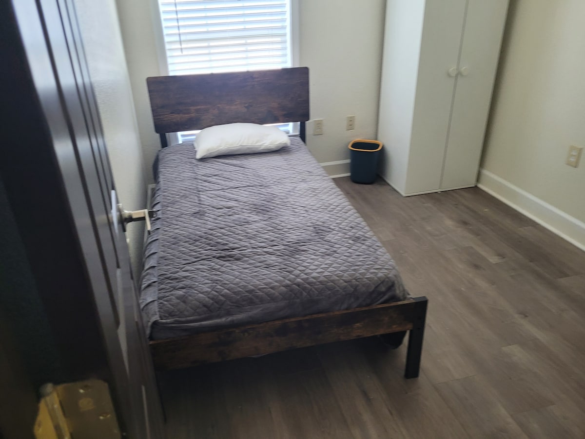 Large stylish room inside of spacious home with 12 Ft ceilings. This room provides accommodations for 3. Catch up on your ZZZZZZ's on your queen size mattress complete with fresh linens. Also inside the room is a twin size adjustable bed. The floor plan is a Jack and Jill style room meaning a bathroom in the middle with a bedroom on each side. You will share the bathroom with 1 other person. Fully equipped separate kitchen and a mini fridge in each bedroom. Washer and dryer on site. Cya soon !