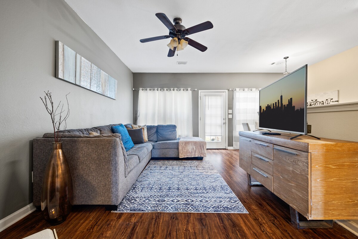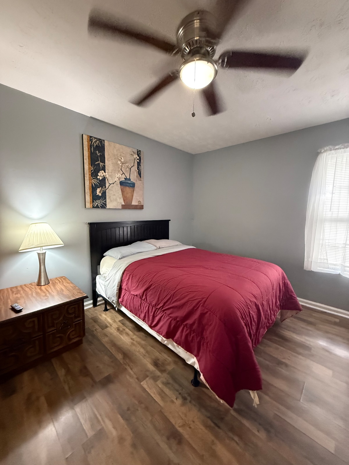 This is a cozy bedroom with luxury vinyl plank floors and spacious closet. Smart Tv mounted for guest convenience. Private bath is located across the hall and is dedicated for this room.