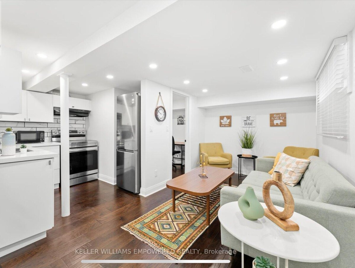 Welcome to a cozy and stylish one-bedroom apartment featuring a brand new queen-sized mattress and a spacious closet for your convenience. The living room is furnished with a comfortable sofa, perfect for relaxing or entertaining guests. The fully equipped kitchen boasts modern appliances, including a dishwasher, coffee maker, kettle, and toaster, making meal preparation a breeze. Enjoy the convenience of an in-suite laundry facility, and revel in the abundant natural light pouring in through the large windows. Very bright space with super large custom windows and renovated bathroom. The separate side entrance provides added privacy, and you'll have the luxury of two complimentary parking spaces. The rest of the house (Main & 2nd floors of the house) is a separate unit entirely with a separate entrance and it’s not part of this listing.