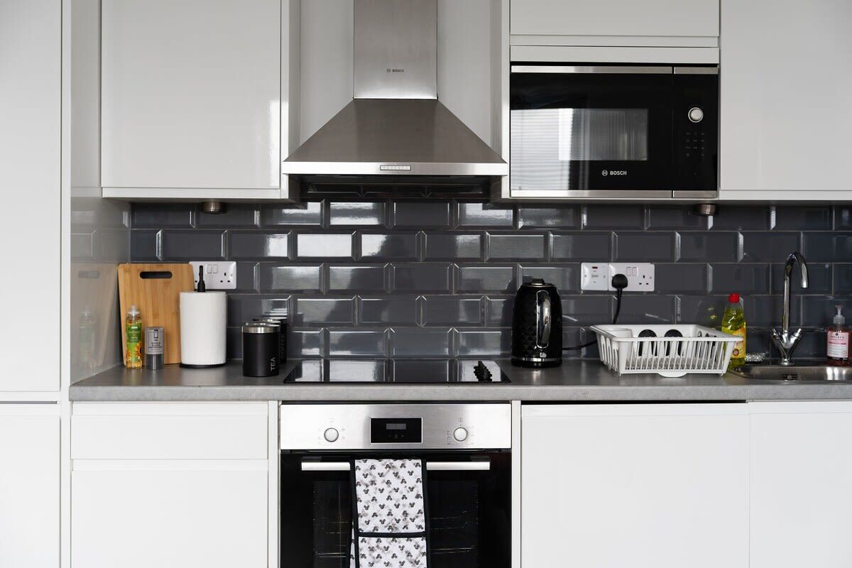 - Full kitchen with oven, gas hob, kettle, microwave, and dedicated fridge space