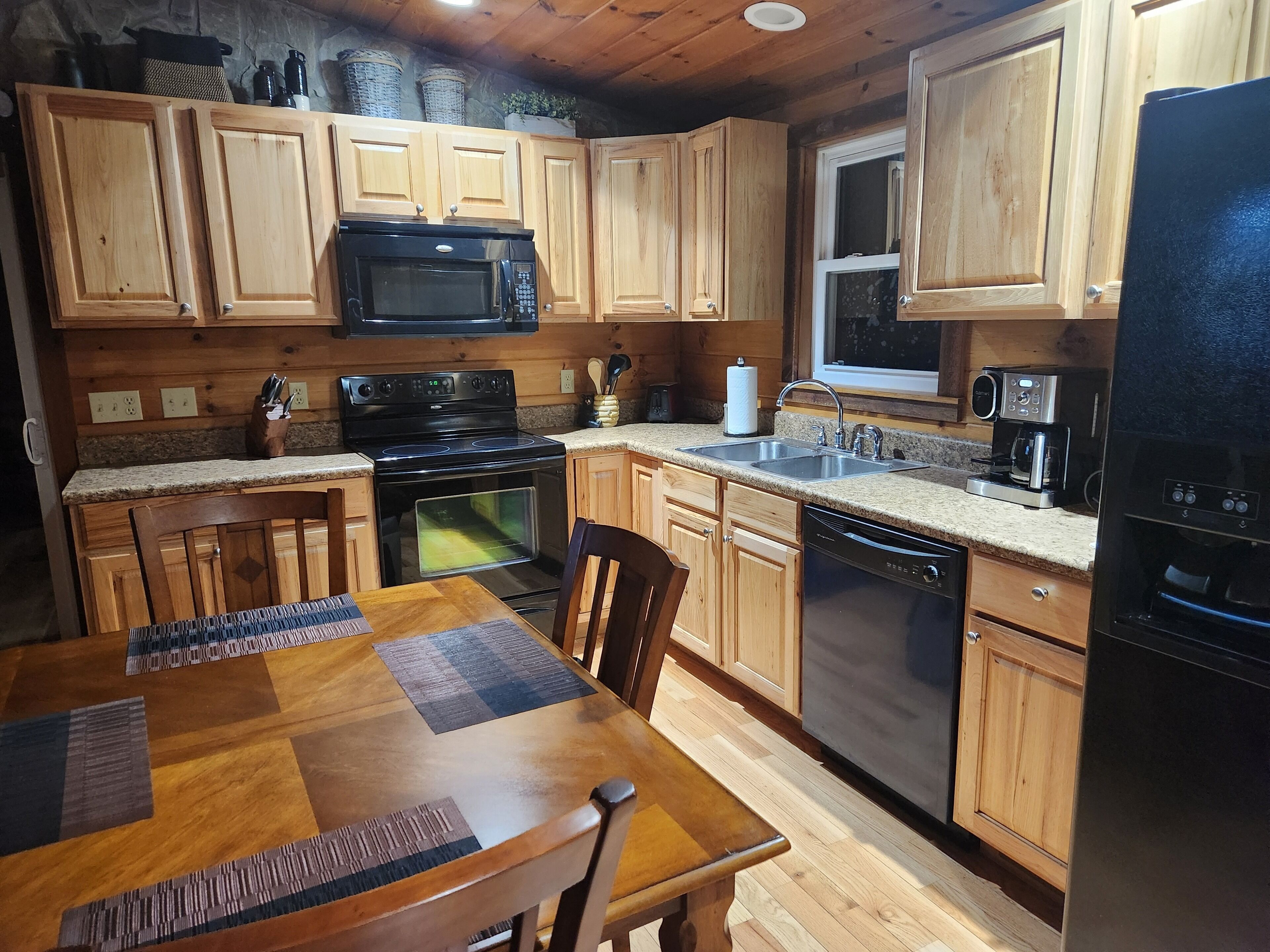 The open living, kitchen, and dining area means no one will be cut off from the action. We are fully stocked with a petite oven and stovetop, microwave, plenty of utensils, cookware, glassware, and a k cup coffee maker.