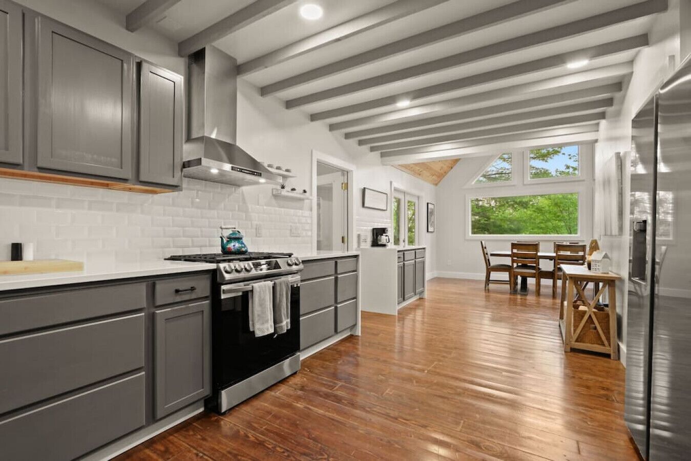 This fully equipped kitchen is modern and wonderfully appointed. It includes an open kitchen bar seating area, which is perfect for entertaining and enjoying a beverage with home cooked meals or take out.