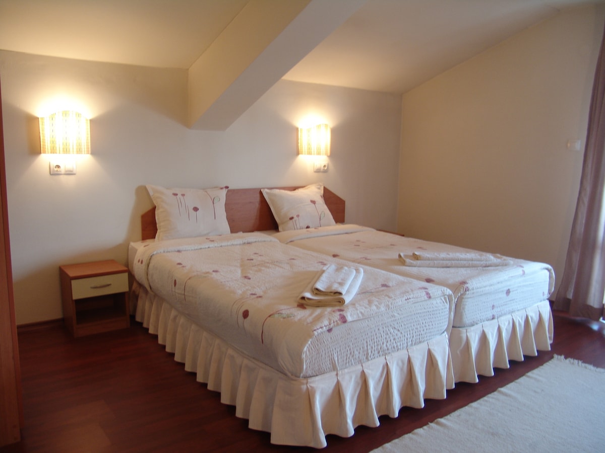 We offer the accommodation in double rooms and studios. All rooms are equipped with a TV set with cable TV, as every room is ensuite. Most of the rooms have terraces that offer splendid views of the Pirin mountain. If you have your laptop with you, you can use our ADSL internet connection for free in your room. There is a lobby bar, a living room with a garden, 24 hour reception and parking space.