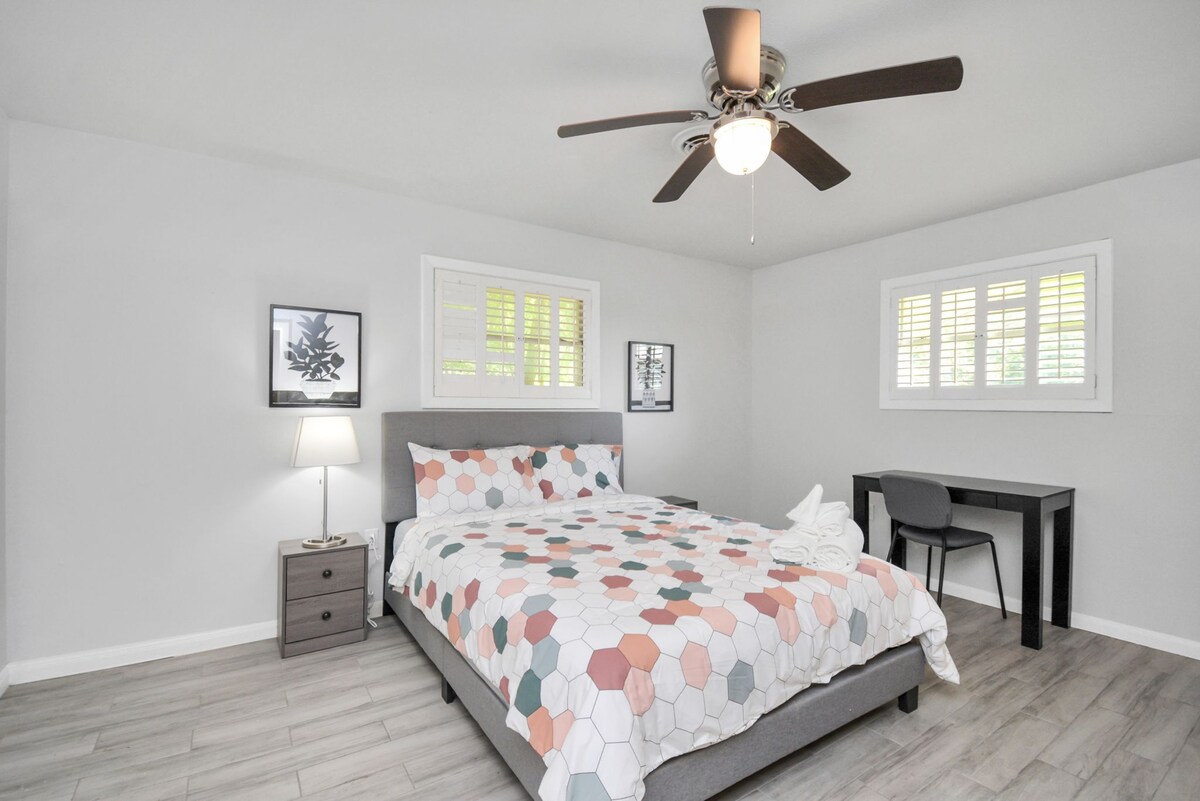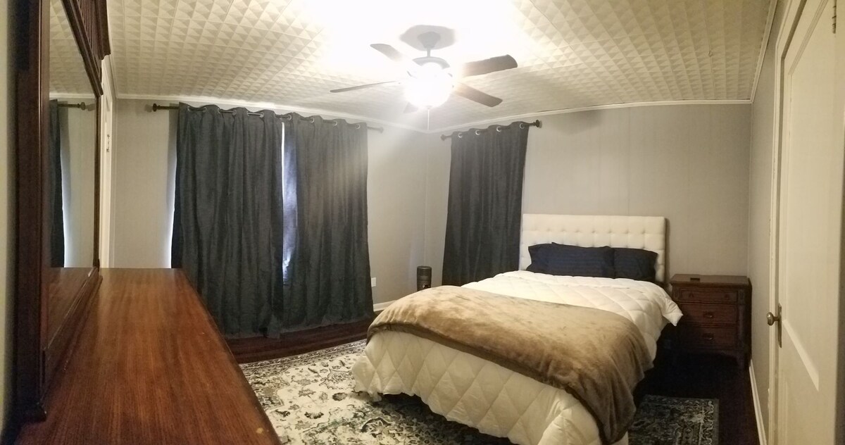 Spacious furnished room with California King adjustable bed, TV, internet, and blackout curtains. Can use the kitchen, living room with75" tv, laundry, enclosed sunroom.
