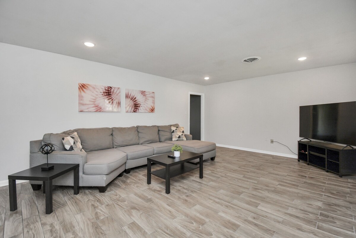 Unwind in this 3-bedroom haven! King bed in one room, Queens in the others. Relax in the living room with smart TVs & Wi-Fi. Cook up feasts in the fully stocked kitchen or grill outdoors. Washer/dryer included for hassle-free stays. Perfect for family trips or business!