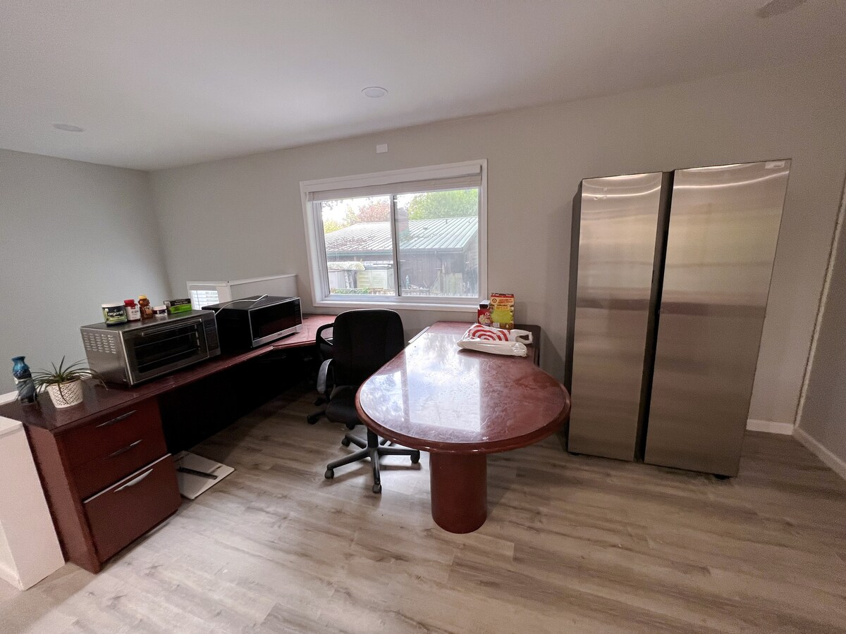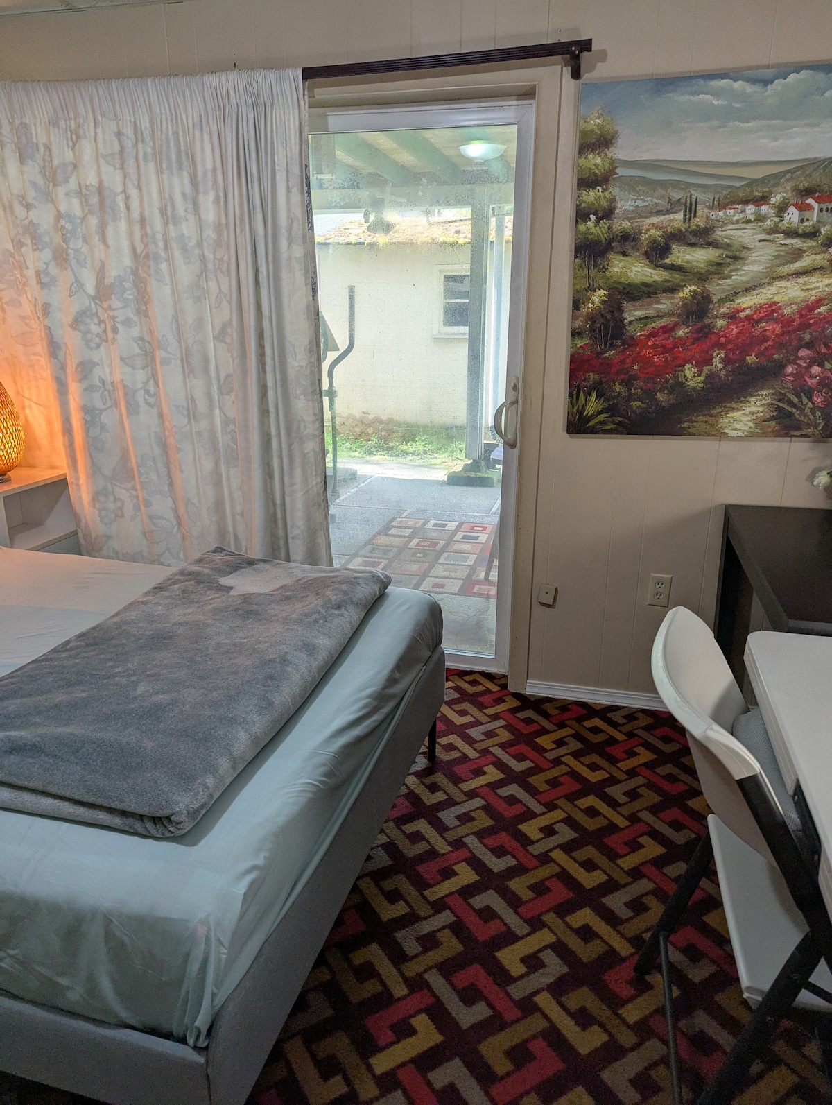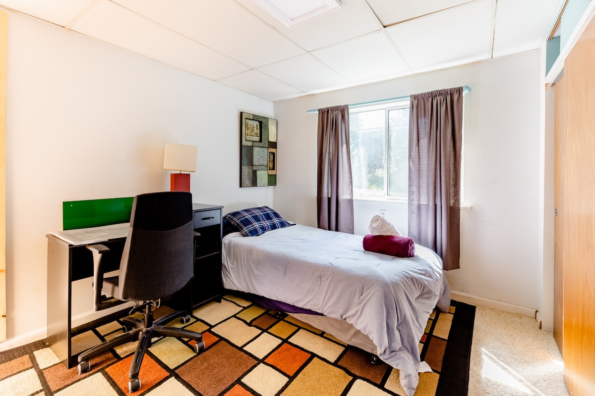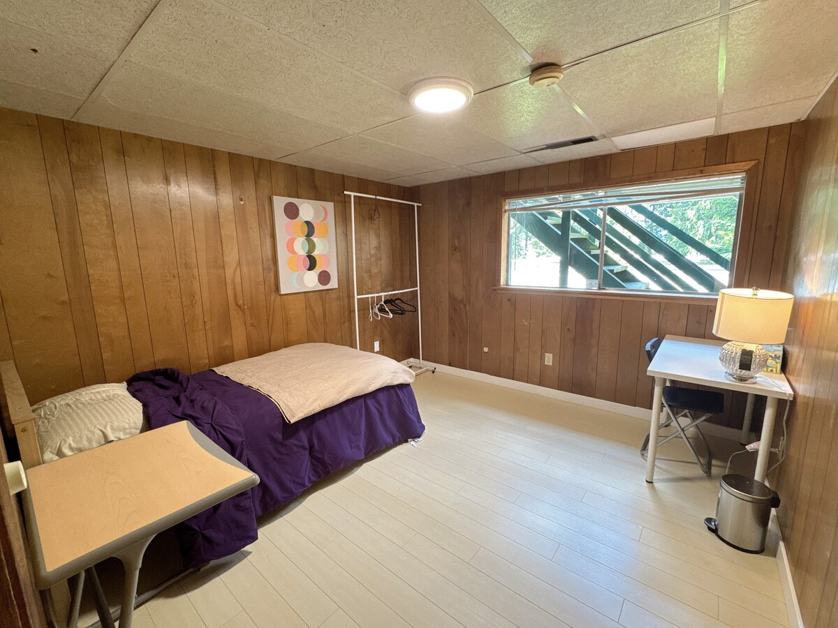 Furnished with desk, chair, and a single twin xl bed. Window view to back yard space. Private entry to the bedroom.