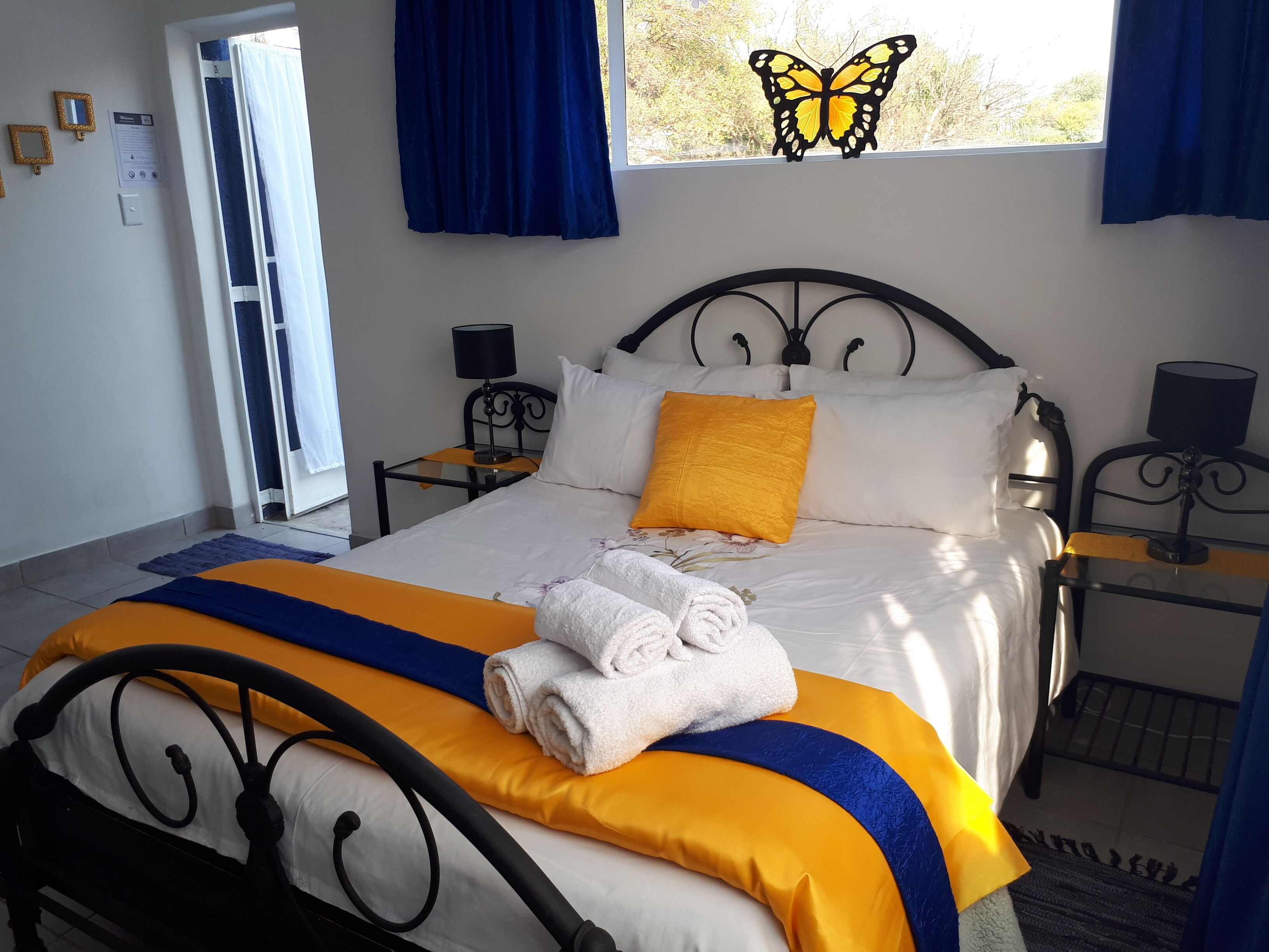 The Butterfly Room has a Queen size bed with linens, blankets and pillows provided. We include towels, shampoo, conditioner and body-wash. This is our wheelchair friendly room with no steps and grab-rails in the shower and toilet.