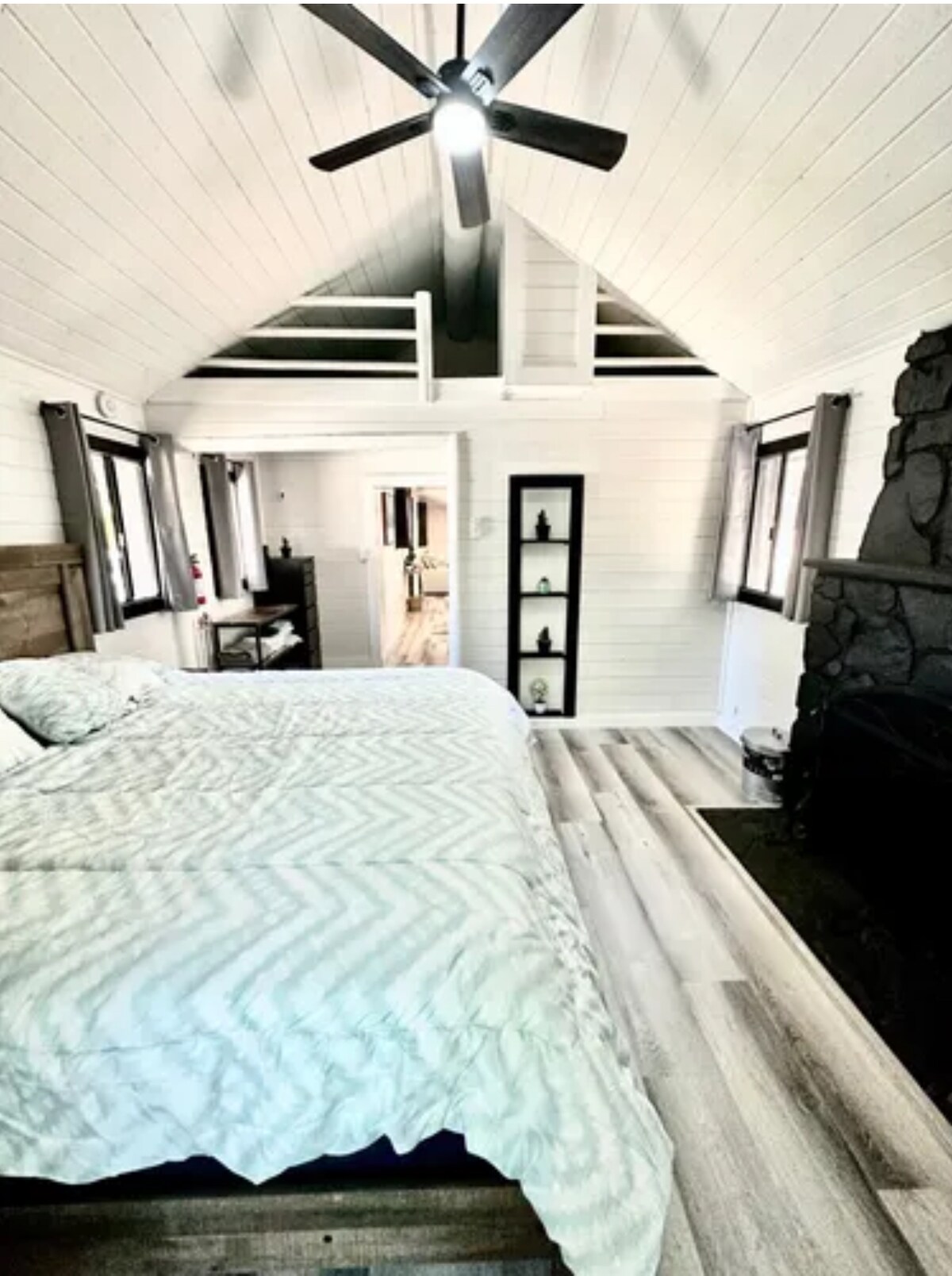 Our cabin feels much more spacious than it is with the abundant light that pours into the main living area from the two massive A-frame windows on the front facade. Downstairs you will find the main living area with a TV, and infrared wall fireplace that flows into a modern and well equipped kitchen with everything you need including refrigerator, gas stove, full size microwave, food disposal, coffee maker, pots, pans and all the dishes for your stay. Outside the fully fenced back yard is great for dining or relaxing in the 4 person hot tub . The main bedroom has a king size bed and closet and the full bathroom features a tub/shower combo with rainfall shower head. No need to bring any bedding or towels, we also provide bed/bath linens and limited toiletries like shampoo/conditioner/shower gel, and a hair dryer. An open style loft is upstairs that also takes advantage of those large front windows. This is bedroom #2 and it includes a queen size bed, one twin bed, and walk in closet.