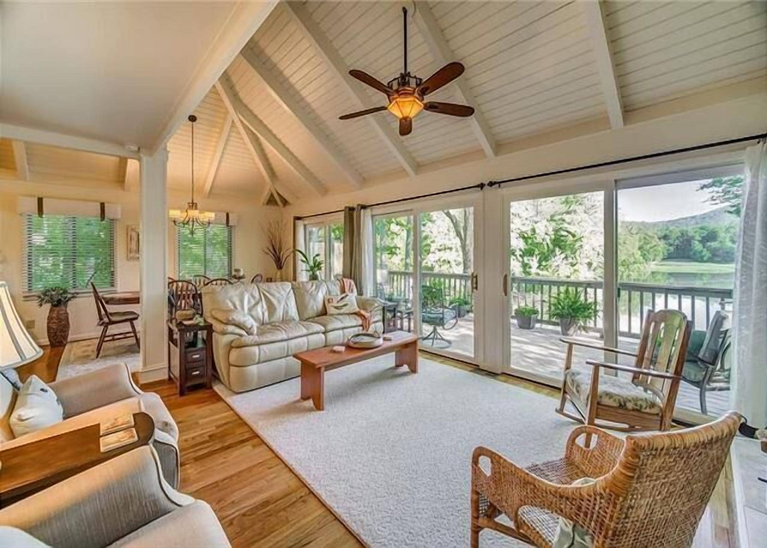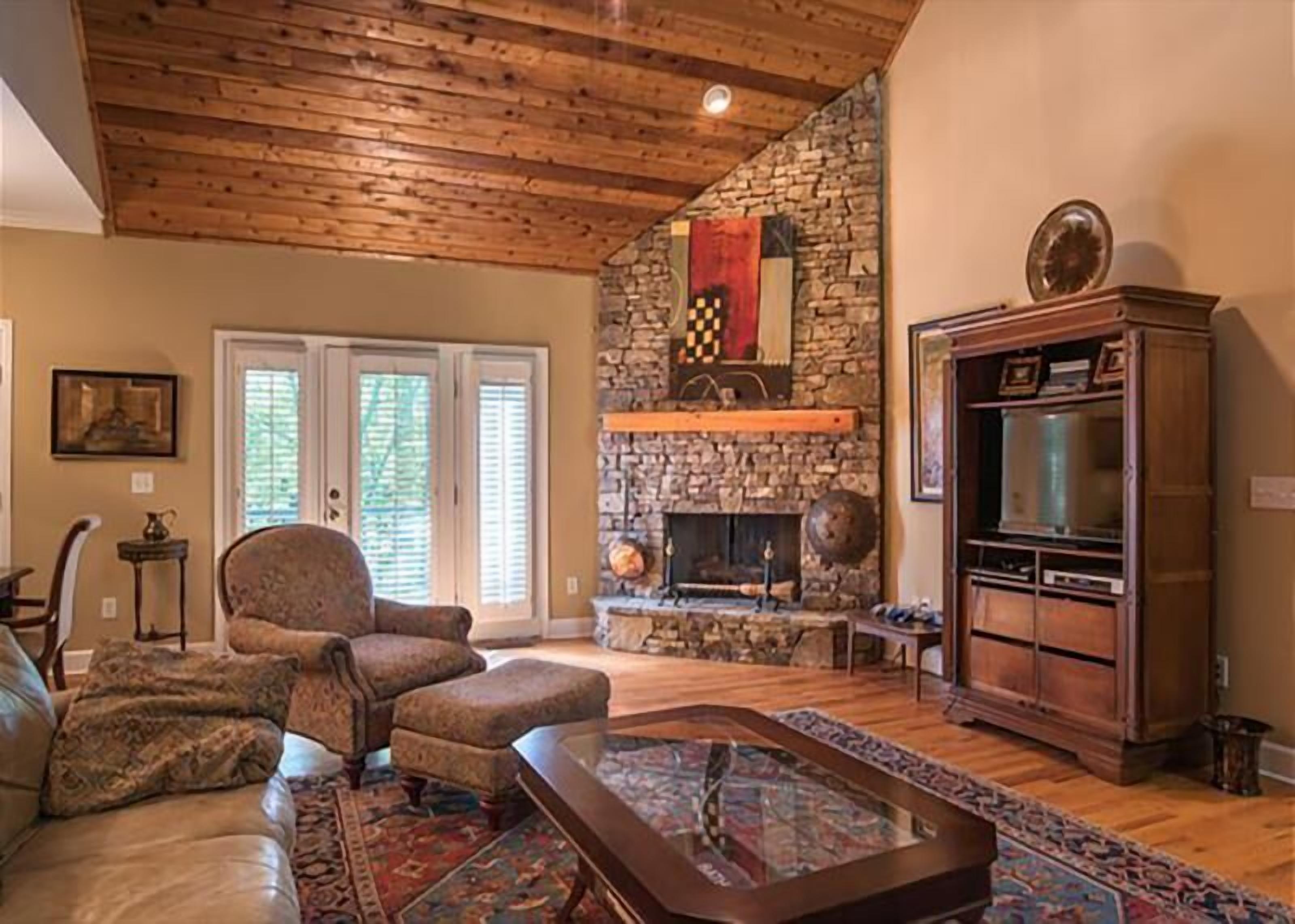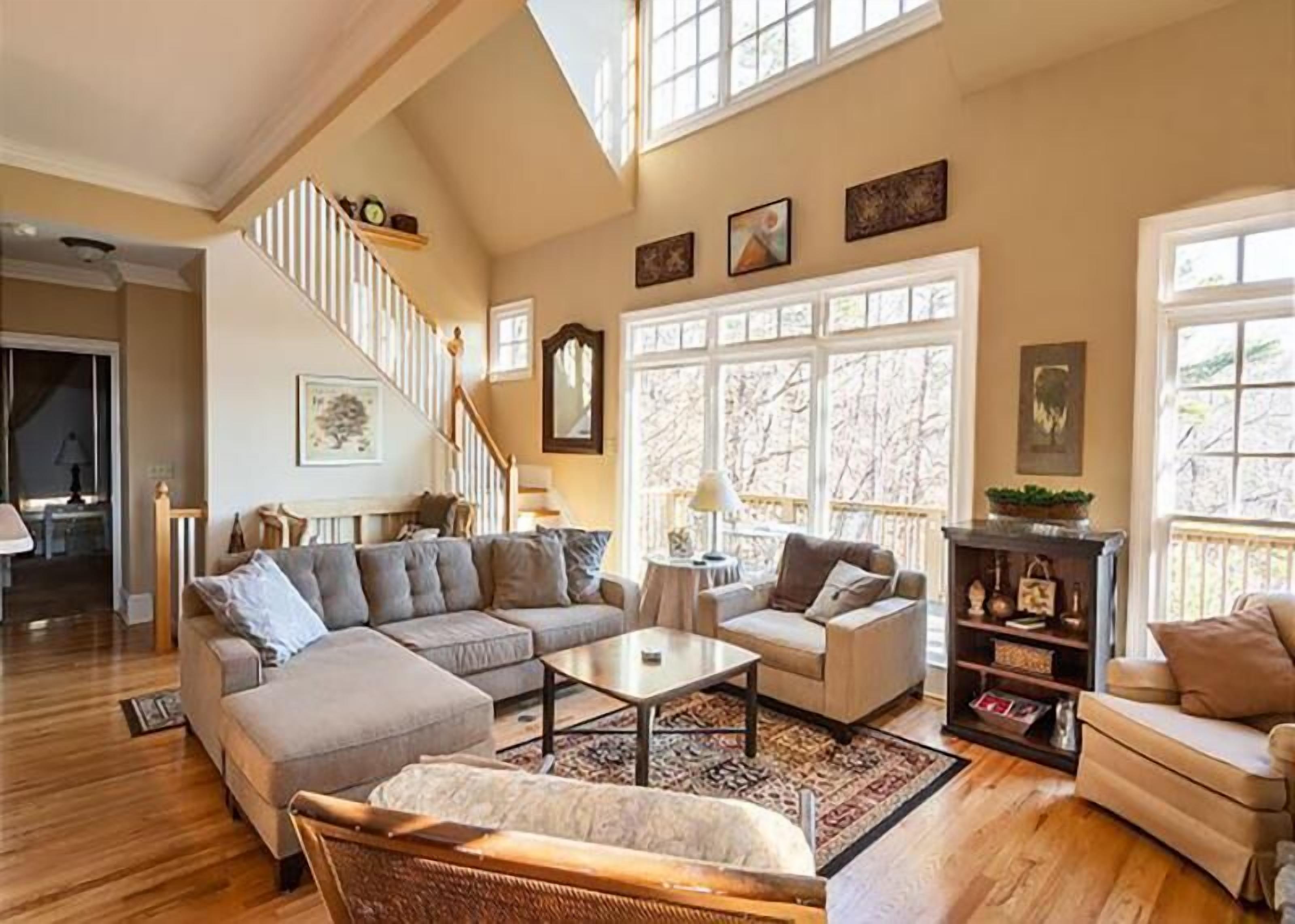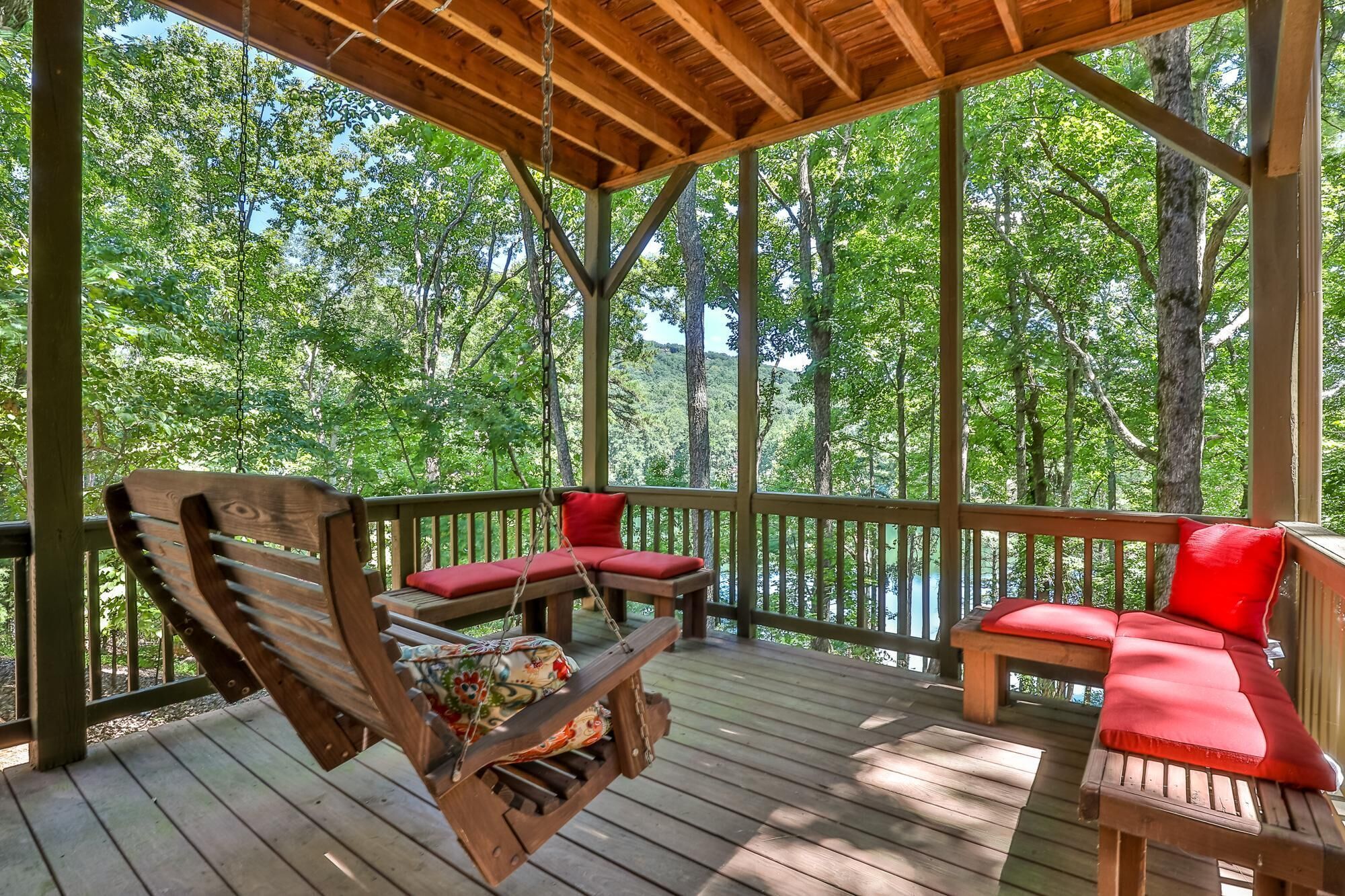 Enter by the spacious front porch, with sitting area and deck swing. Just inside, is the cozy, stylish living room with chandelier, large comfortable sofas and fireplace- perfect for watching the fire or game night. At the back, a gorgeous sitting porch offers relaxed seating and dining, for time in nature at time of day. A gas grill with views of nature- on the wrap around porch will wow any bbq chef. :)