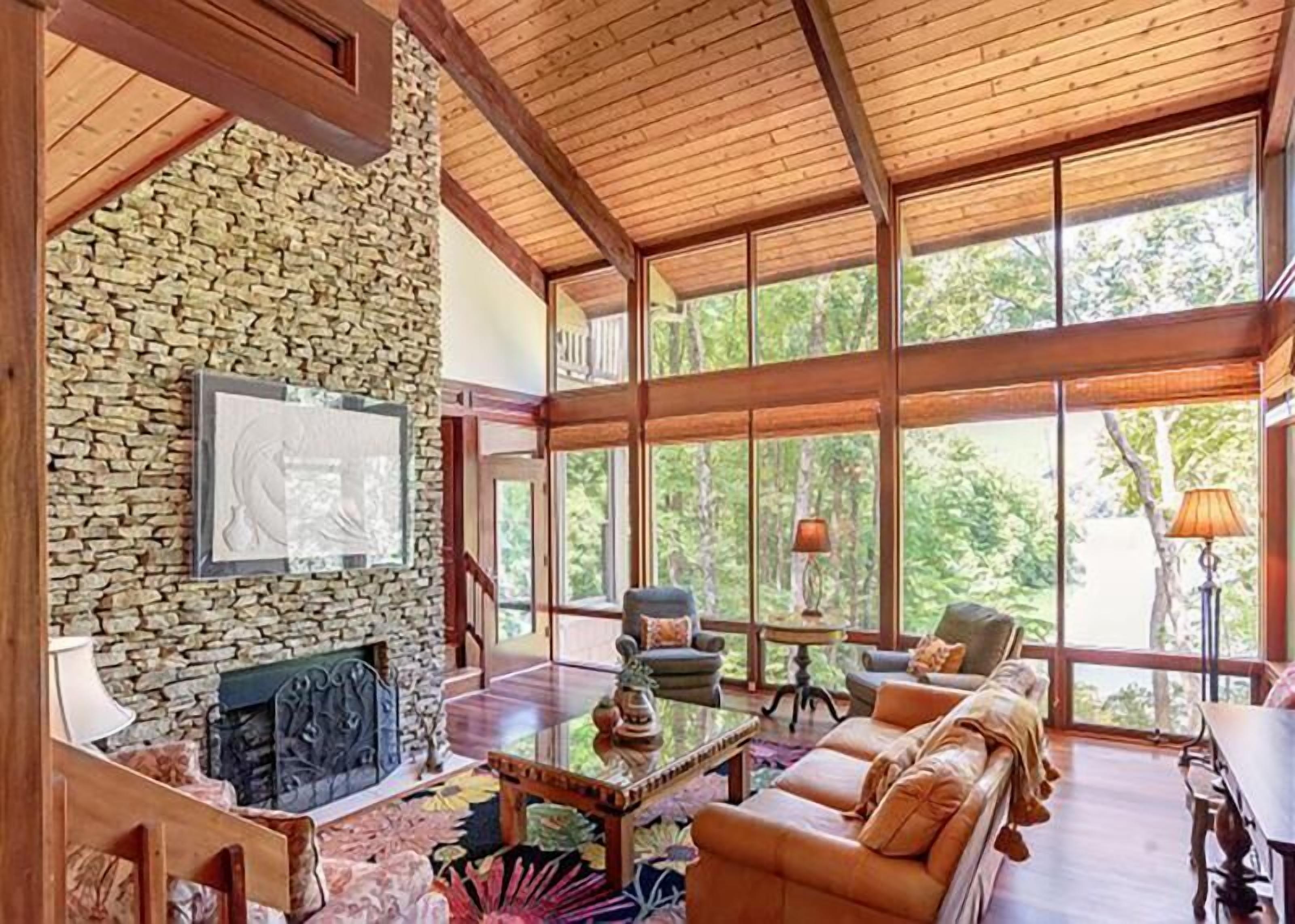 Featuring a wood burning fireplace, lake and rockslide view, with an outdoor bar overlooking the woods - this is the retreat you've been looking for, with all the modern amenities; a coffee bar, 70 in smart tv, Smart Home and more.