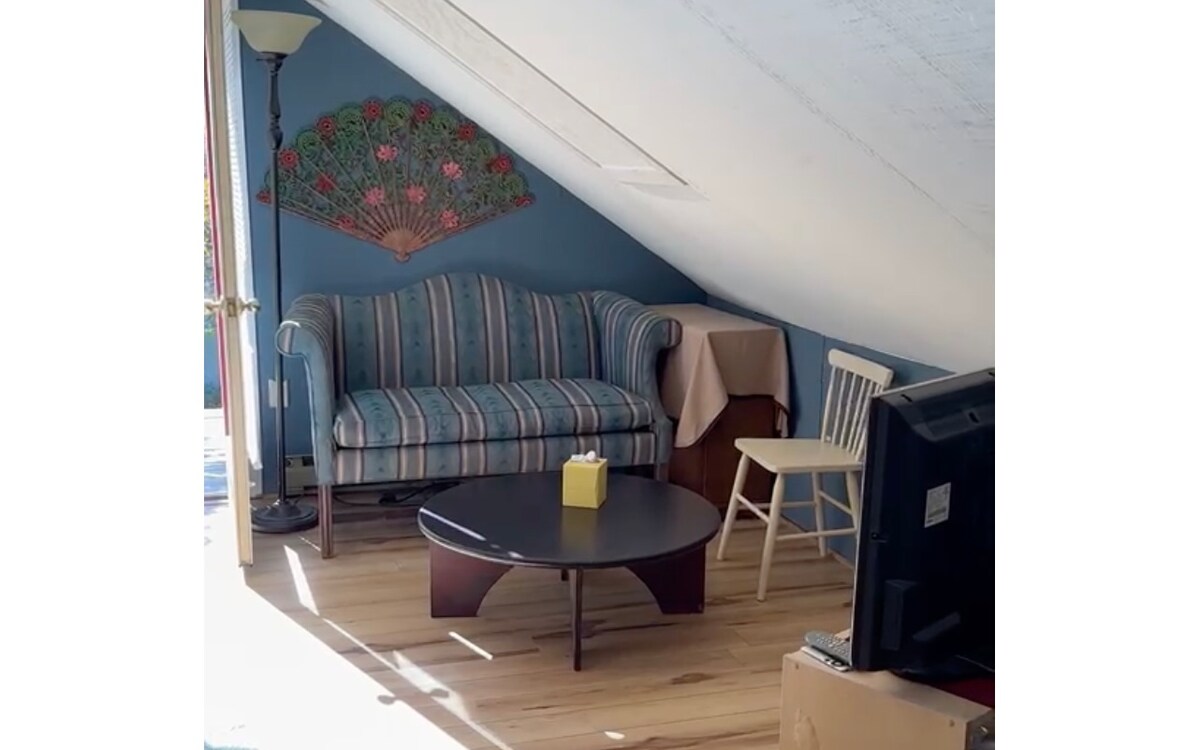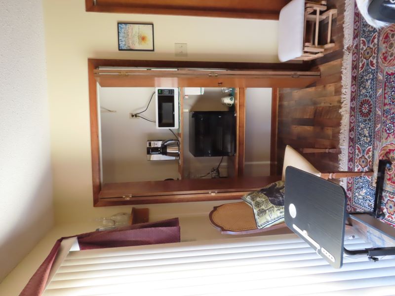 Queen bed, (linens provided) desk, chest, Bathroom, shower. Sitting area with loveseat and TV set for streaming. Kitchenette has small fridge, microwave, toaster oven, coffee maker. Dishes provided.
