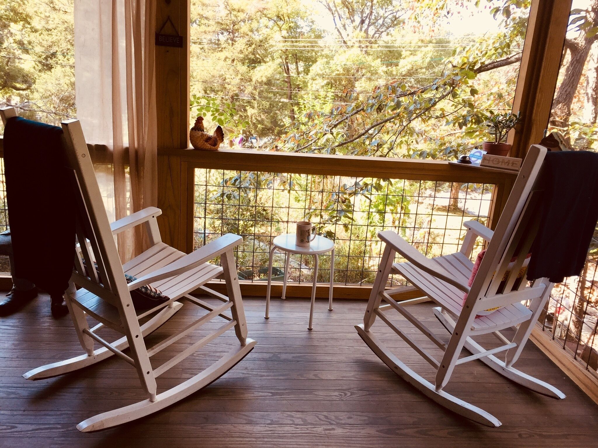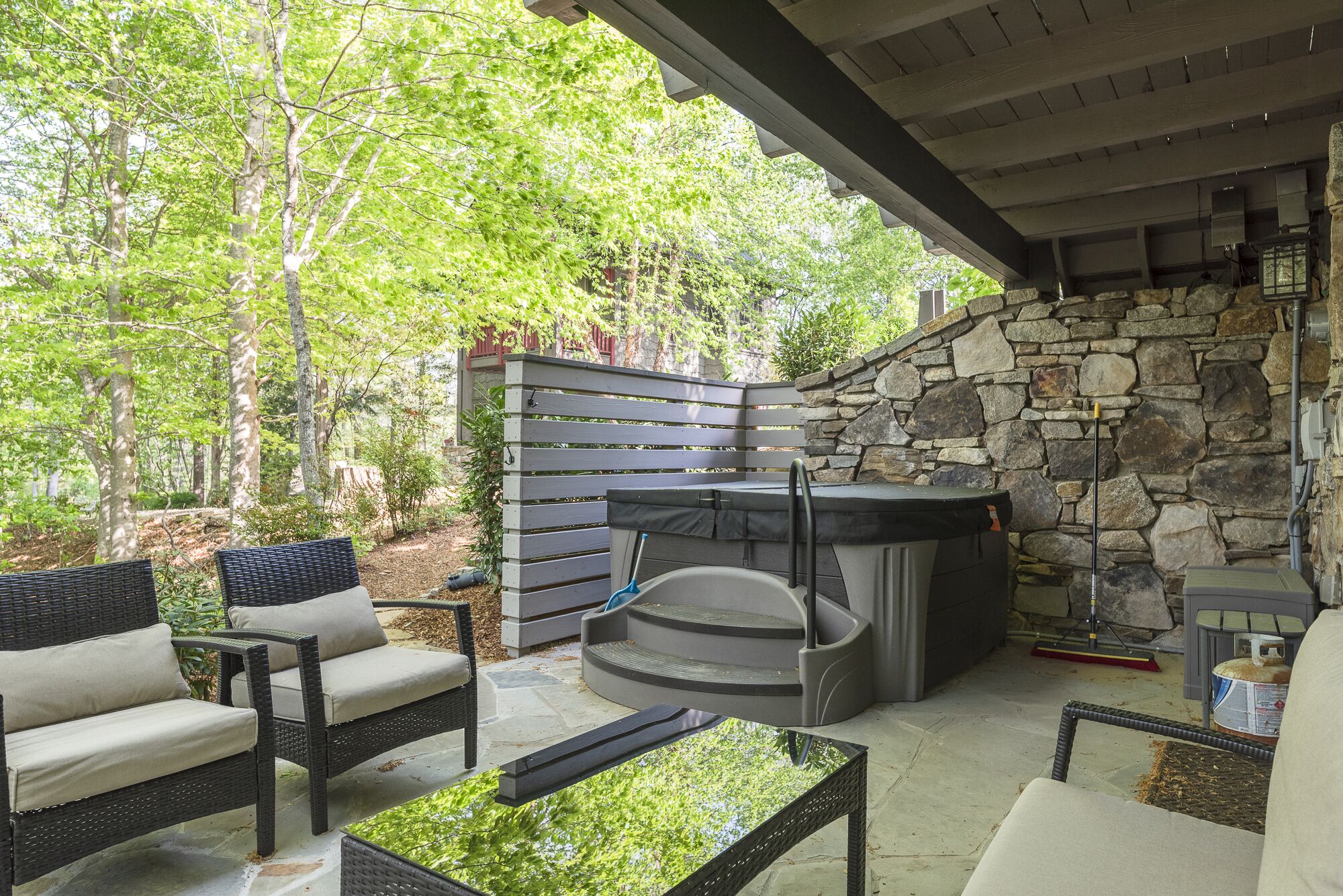 You have a private living room and covered patio where you can watch TV, sip morning coffee with garden and mountain views. Outside of your private patio there is a fire pit with seating to enjoy the stars or mountain views.