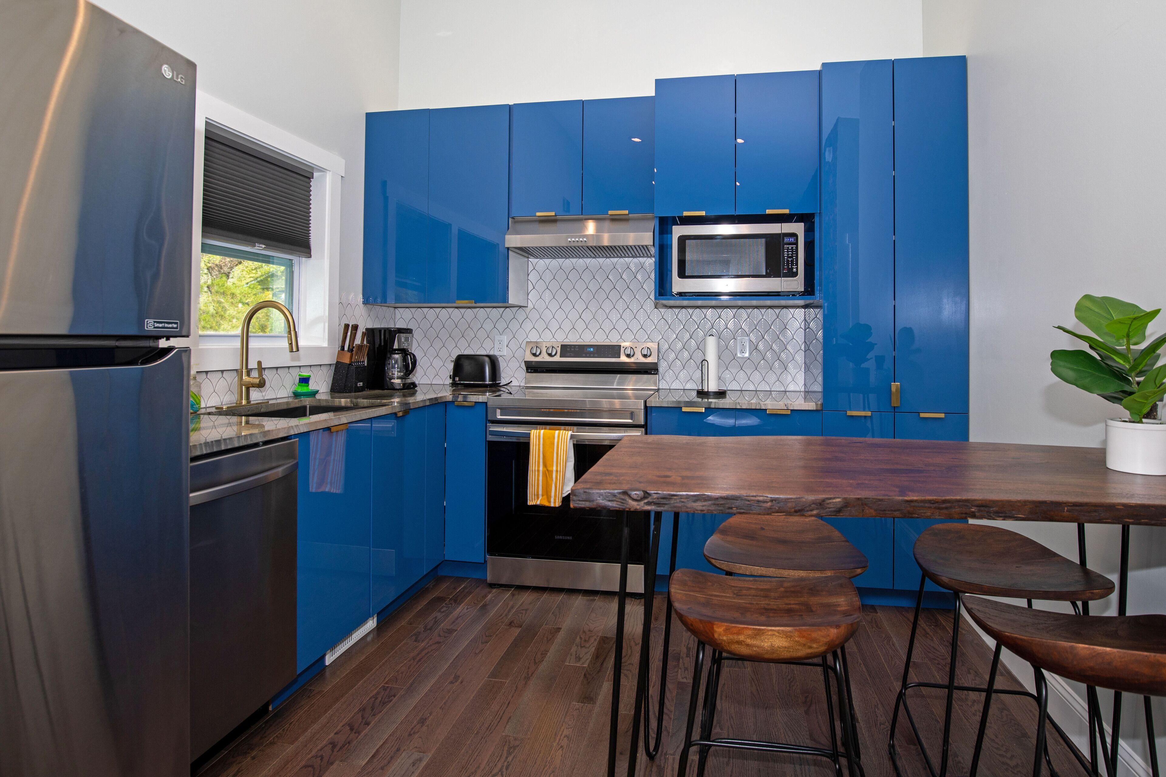 The large kitchen counter area, complete with overhead lighting and bar stools, doubles as a work area—ideal for catching up on emails or enjoying a quiet morning with coffee and your laptop.