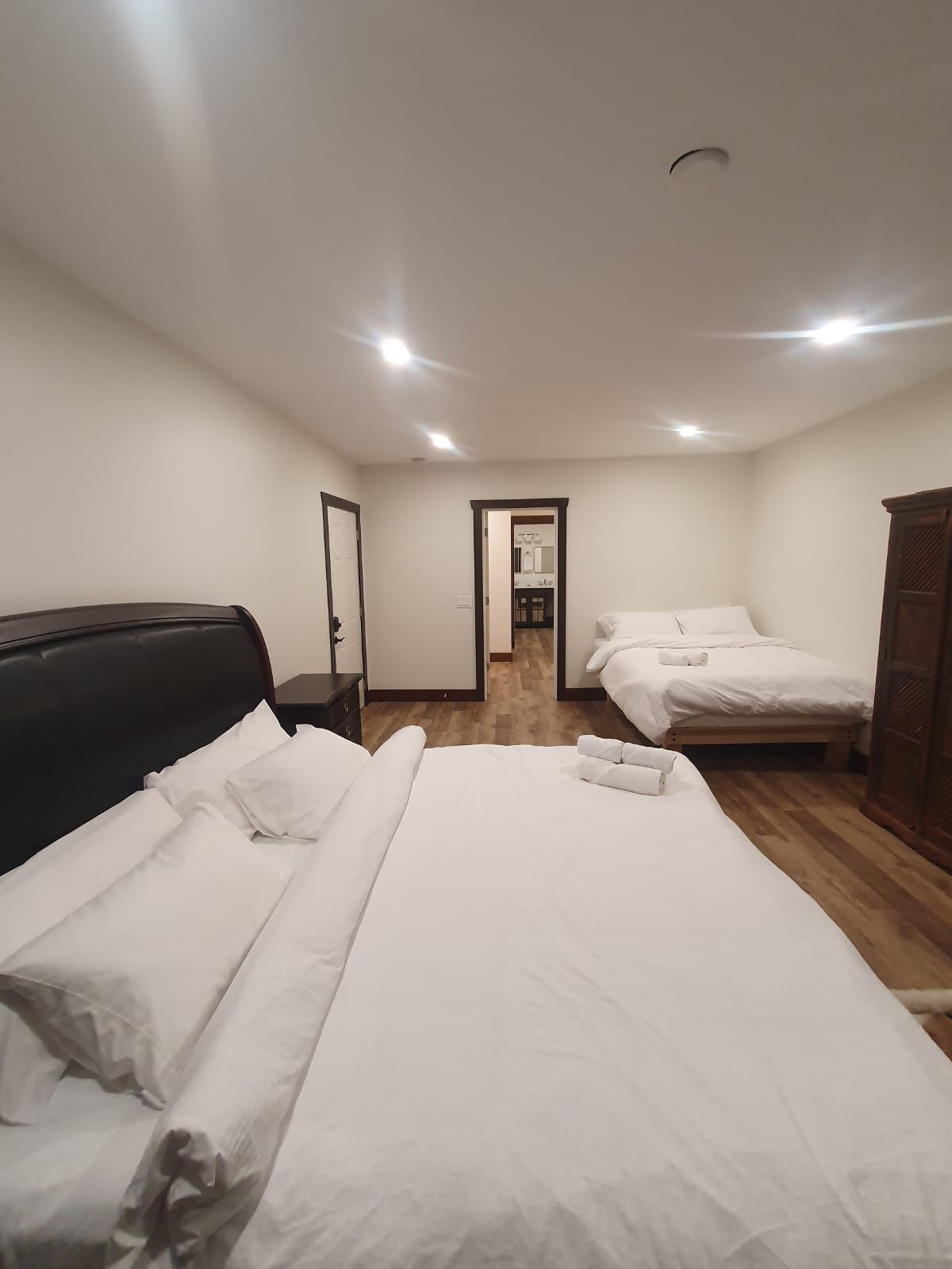 Upper level, two bedroom suite, complete with a twin size pullout ottoman sofa bed in the living area. One room has a queen sized bunk bed, and the other has a king sized bed, both featuring Canadian made Douglas mattresses and luxurious bedding to ensure a good night's rest. You will have a full kitchen, dining and living areas, private laundry and a full bathroom, including a shower/tub combo. This suite is equipped with a 60" Smart TV, as well as access to Netflix and complimentary WIFI.