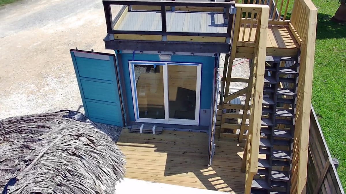 Guests have exclusive access to the entire container home and the upper and lower decks. Shared community spaces include the laundry trailer, playground, firepit, grills and palapas