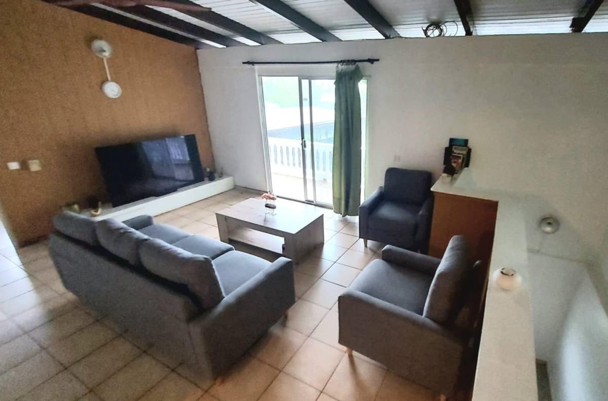 Patio next to the rainwater swimming pool of the family house, BBQ available. We provide linen. Bathroom for 2 bedrooms Mobile air conditioning on demand for 5000 cfp per day. Possibility to use the washing machine