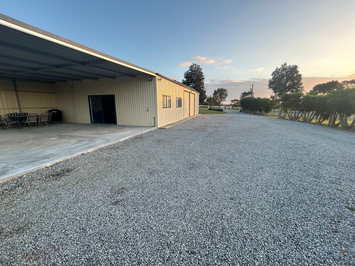 This is a newly built guesthouse attached to a large shed on the farm property. There is 2 spacious bedrooms along with a lovely living area and a very modern bathroom supplied with clean rain water. This space is situated on a lovely property only 7km from the centre of town and only 3km from the beach.