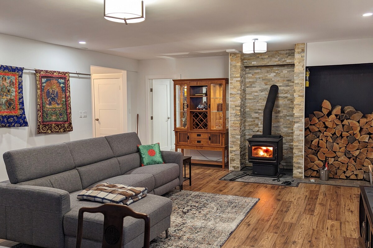 You'll be staying in the upper floor of a 2 unit home. Your area has a large bedroom, a bright sunroom that serves as an office space, and an open living/ dining area with a wood burning fireplace and a large flat screen TV.