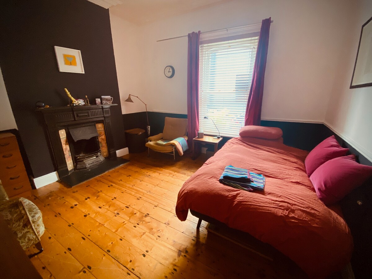 This spacious living room features a big window and an open fire. You are on the ground floor at the front of house with use of the spacious kitchen/fridge etc from 8.30am-7.30pm. The bed is a firm, good quality small double sofa bed with memory foam topper. It is offered only as a single (mail me if you are travelling with a young child).