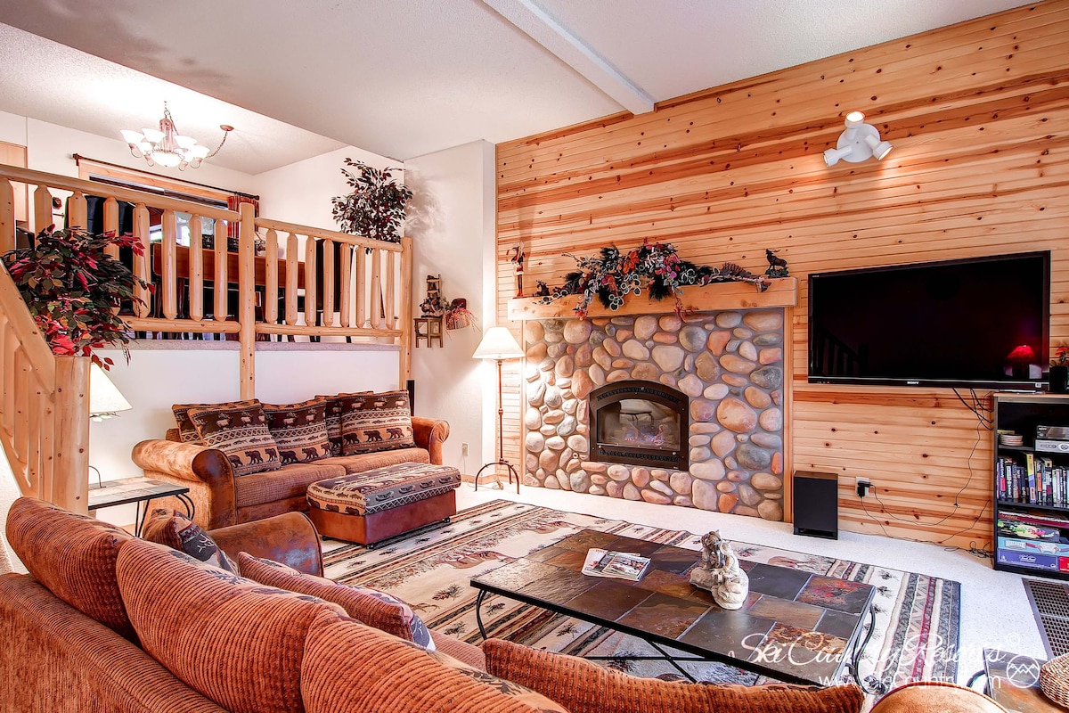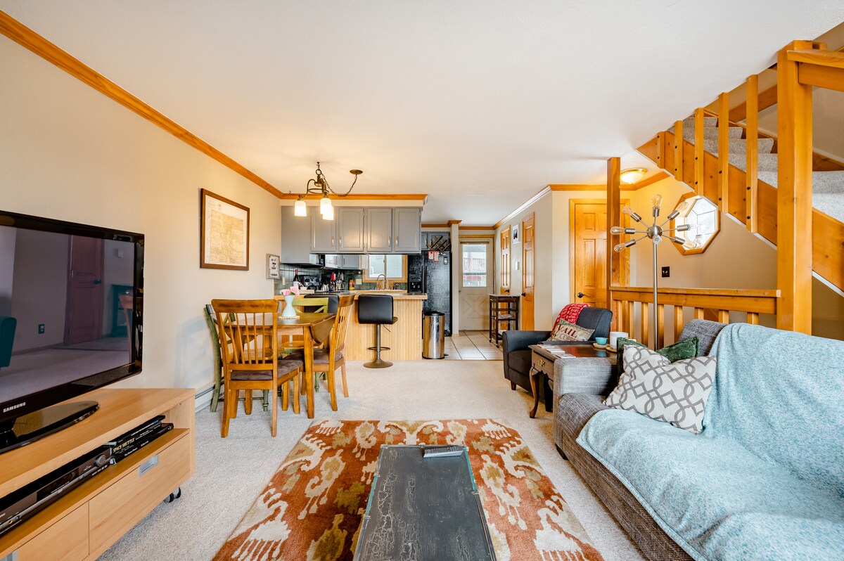 As you step inside, you'll be greeted by the inviting ambiance of this home's mountain-inspired decor throughout. The 1,392 square feet of this multi-level townhome features an open design, creating a spacious and comfortable atmosphere for you to unwind in. The living room takes center stage, featuring a decorative rock gas fireplace that sets the perfect mood. The large flat screen TV with DVD player and abundance of plush seating create the perfect ambiance for a movie or game night with family and friends. Adjacent to the living room, you'll find an outdoor patio where you can soak up the sun and enjoy moments of relaxation during the summer season.