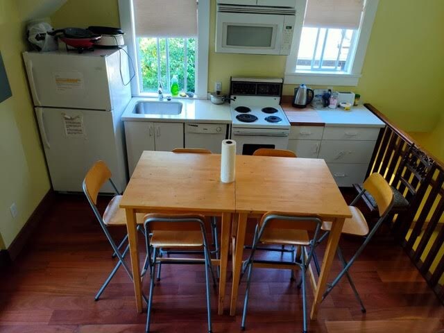 In the suite - full kitchen, dining and bathroom (shower); laundry and dryer is shared with the other suite; once a week laundry as much as possible
