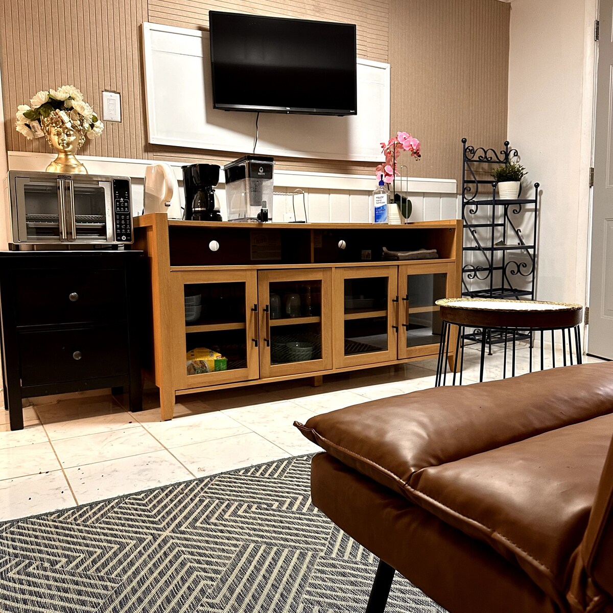 Inside the home you have a small kitchen that includes a small refrigerator, sink, microwave and burner for cooking. It's also stocked with plates, cutlery and glasses for your use. The living area has a comfortable couch, smart TV for streaming and plenty of space to relax.