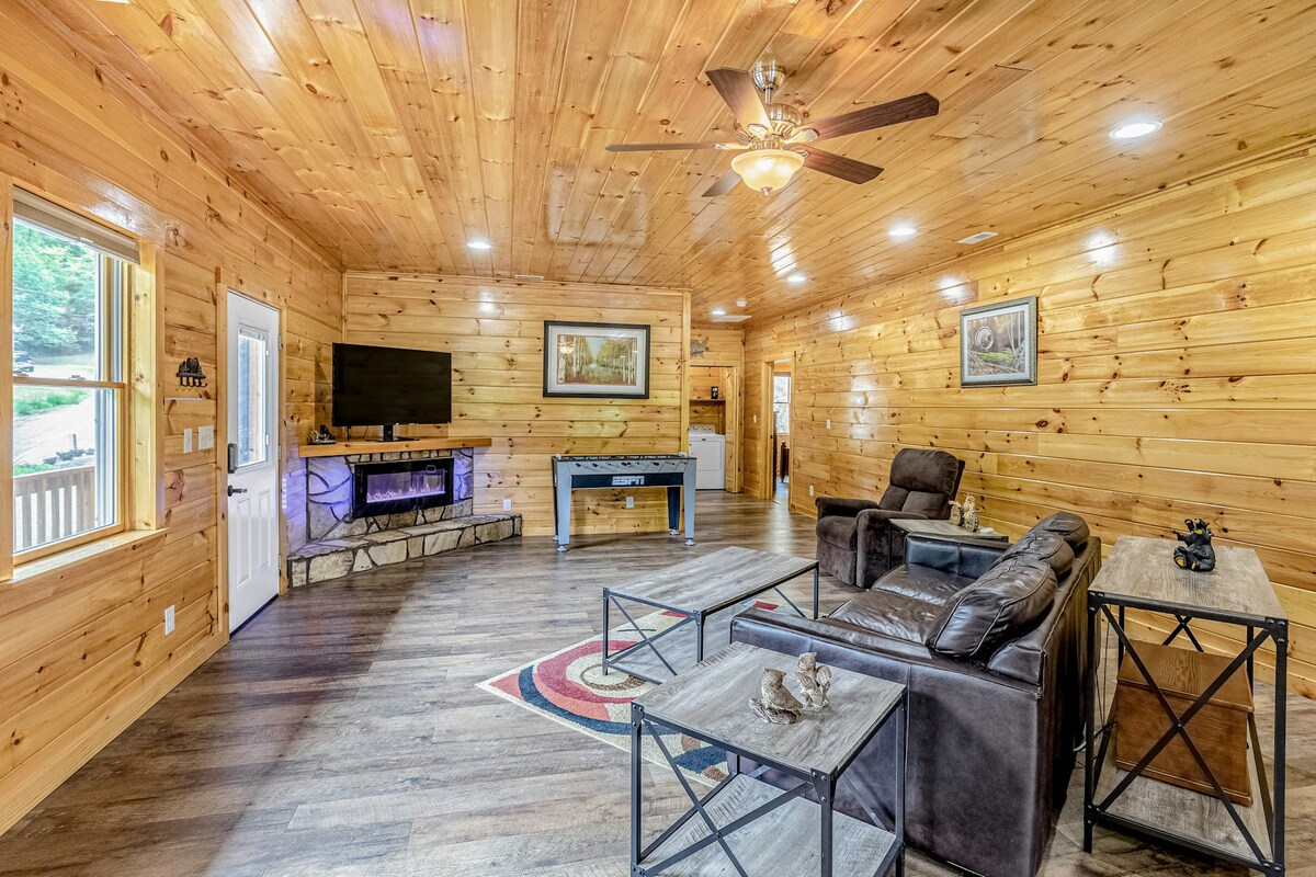 Inside, you'll be surrounded by a rustic, yet charming atmosphere. Let your friends unwind and rest after a fun-filled day and treat them to delicious meals or snacks prepared in the fully-equipped kitchen. There, you'll find incredible stainless steel appliances, including a French door fridge, dishwasher, Keurig and regular coffee makers, microwave, and more! The kitchen includes a convenient dining table in case it's too chilly to dine outdoors.