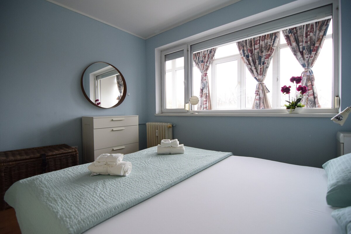 The bedroom brings the zen right to you, a king size bed, a white wardrobe and large and bright windows.