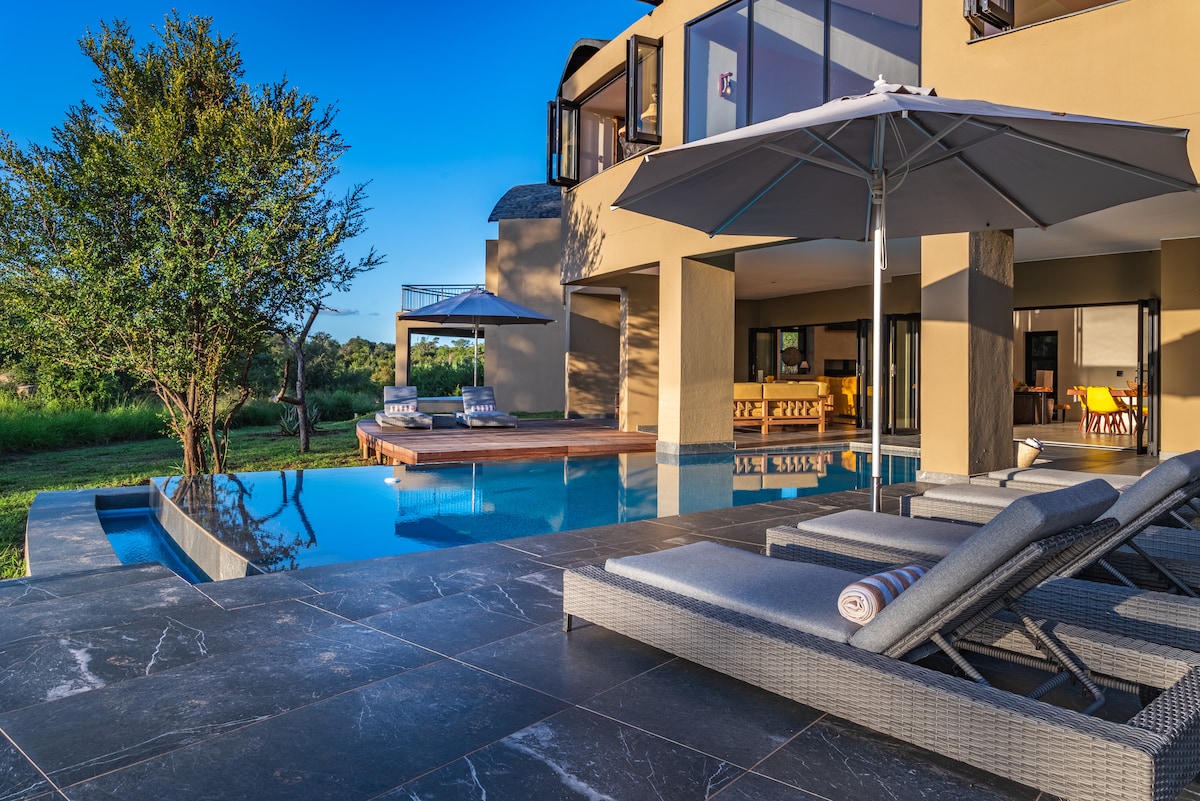 In a security patrolled luxury estate, and located on the banks of the stunning Sabie River, with views directly over the river and into the Kruger National Park, the newly built Nkova Sabie Villa accommodates up to 10 people and provides luxury holiday accommodation for the discerning guest who is looking for comfort in an elegant, tasteful, relaxing environment. This uniquely designed, beautifully spacious self-catered villa has embraced sustainability and recycling in its build, and has been impeccably furnished to give a contemporary feel. Nkova Sabie is located in a secure and private game reserve called Elephant Point and is located 7 minutes from the entrance gate into the Kruger National Park via the Paul Kruger gate. It boasts a new back-up generator which gives you the peace of mind that you will have electricity throughout the Villa 24/7. Relax by the heated infinity pool and lose yourself to the sounds of the bush..... Gather in the boma to enjoy an evening in front of an open fire with friends and family..... Fall asleep to the sounds of the many hippo wallowing in the river and other animals passing by..... Nkova Sabie Villa is a perfect destination for guests who want to explore the Kruger National Park whilst enjoying spectacular accommodation. Services that can be provided during your stay include transfers from Skukuza Airport, Mpumalanga Airport and OR Tambo (Johannesburg), game drives, a chef, mobile spa treatments, local tours and golf. Our lovely housekeeper is also available daily to look after your every need including washing, ironing, and cleaning so that you can truly switch off. The pool, patio and braai area also gets cleaned daily. The villa sleeps up to 10 people. There is also a boma restaurant on the Estate, overlooking the river, which serves breakfast, lunch and dinner if you didn't want to cook.