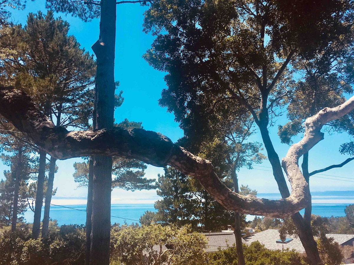 Guests just love the privacy and surrounding beauty of our upstairs guest cottage overlooking a lovely forest to the Pacific Ocean (please check out our 600+ 5-star reviews). Our sparkling-clean suite has it all: comfy charm, peace and quiet, abundant wildlife, private entrance, panoramic forest / ocean views, gorgeous sunsets, fresh cotton linens, micro kitchen, dedicated off-street parking and great mesh WiFi for remote work. All this and the marvelous Central Coast just outside your door.