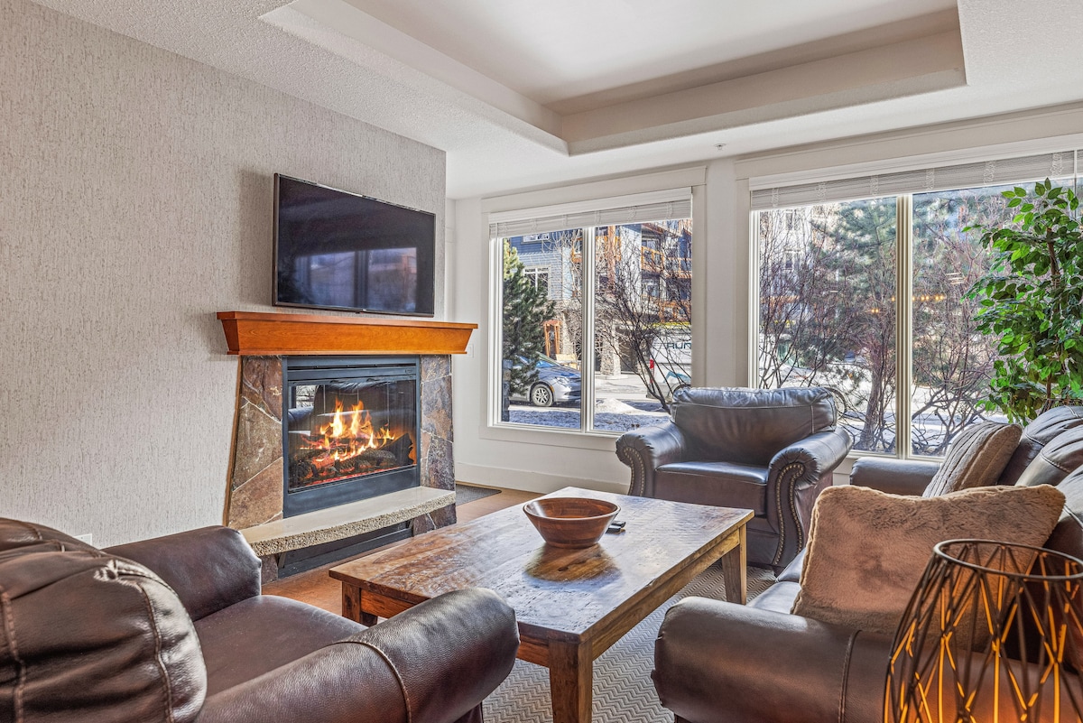 Enjoy mountain views from leather couches by the fireplace. Step onto your private balcony with BBQ and relaxing scenery.
