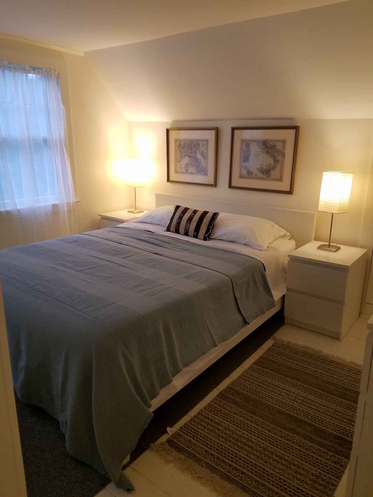 Private bedroom with queen bed, closet, dresser, nightstands, mirror, 2 bright windows, tv/cable/wifi, all linens, laundry facilities, private fridge, toaster oven, microwave, coffee maker, full bathroom. Access - garden, outdoor shower, grill, picnic table, porch. Parking on site.