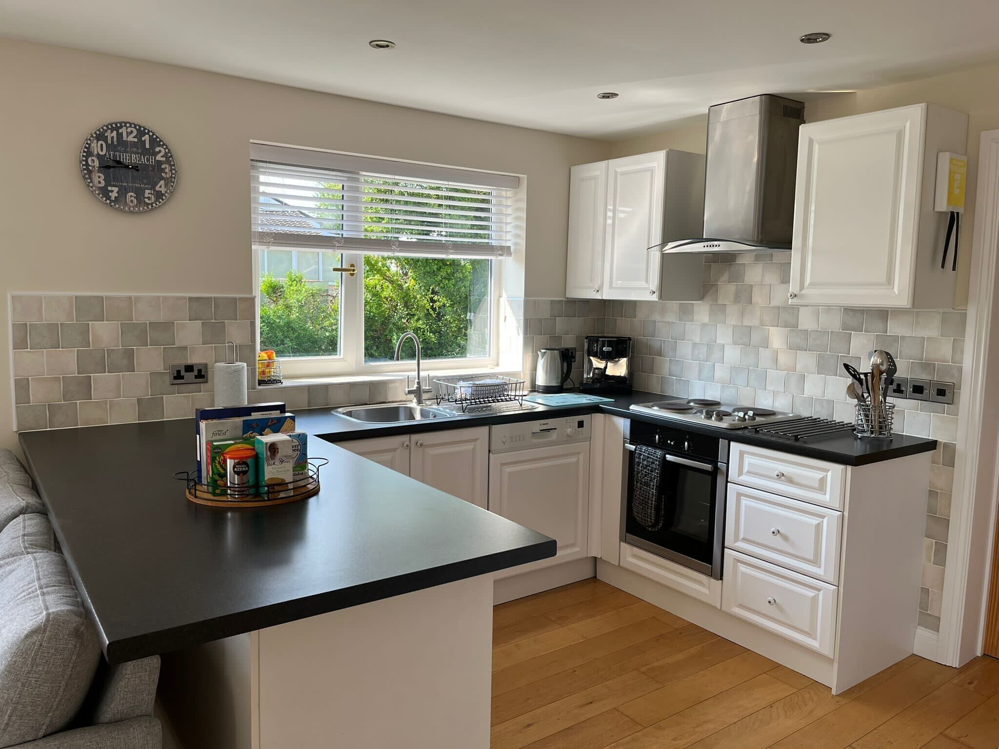 There is a large, secure front garden with outdoor dining furniture. A BBQ and an outdoor wood burner are located on the driveway behind the property. There is off-road parking for 3 cars. There is a fully equipped kitchen, with a large electric range cooker, microwave, toaster, kettle, filter coffee machine, fridge and dishwasher. Next to the kitchen is a utility room with a washing machine, a separate dryer and a large fridge freezer. If you are super organised, you can arrange for a supermarket delivery (Tescos, Cardigan) and there is plenty of space to store all the food either in the fridge/freezer or larder room. There's lots of space to hang up beach towels and leave your gear until the next beach trip.