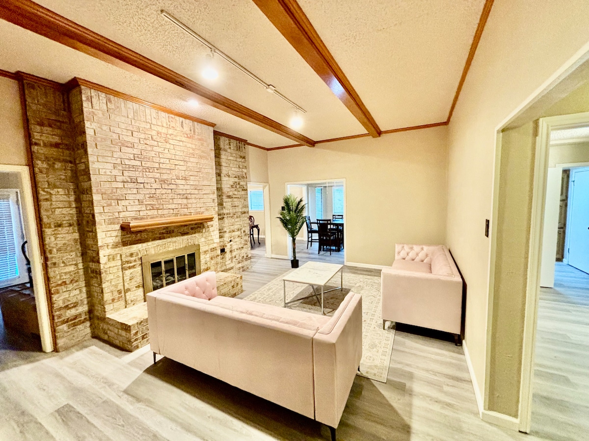 Living Spaces: This home offers two separate living rooms, each outfitted with a smart TV and comfortable, designer furnishings providing flexible spaces for relaxation, work, or entertainment. The main floor’s open-concept design includes large windows and a cozy fireplace, creating a warm and inviting atmosphere.
