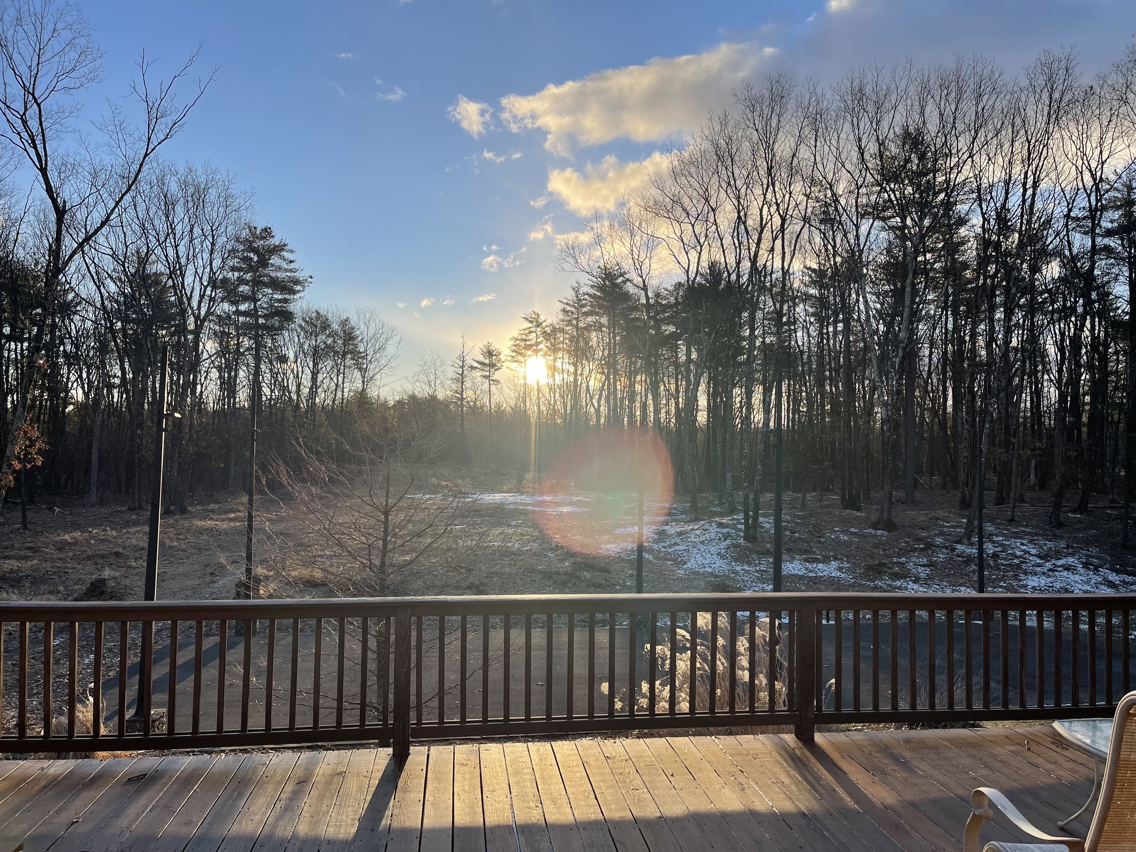 There are outdoor spaces for your use. A huge deck overlooking the River with sunny and shaded sitting areas and a table for eating.