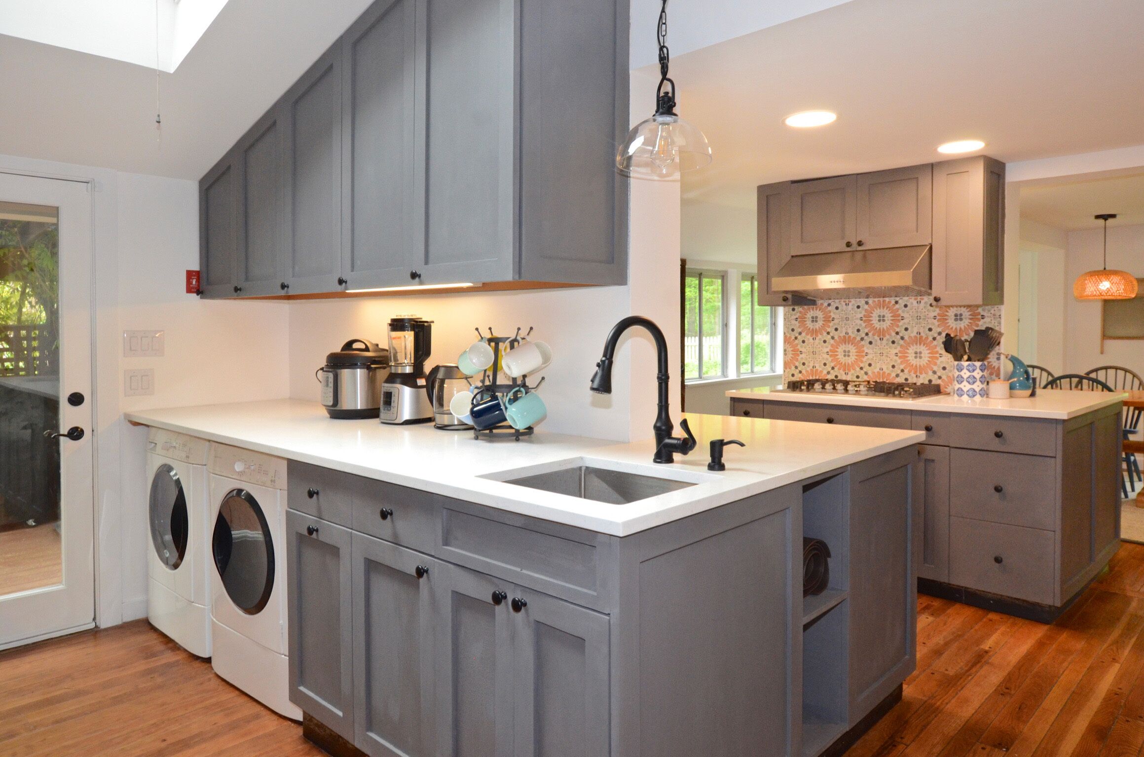 Shady and protected front porch has French table and chairs. Guest door leads directly into the large living room with a vaulted ceiling, overlooking a private wooded area in the back of the house. First door on the right leads to the bathroom and bedroom, through a central hall where there’s a boot bench, umbrellas, shopping bags, full air mattress and coat hooks. Kitchen and dining area can be accessed through the hallway, or through the living room. Kitchen is fully equipped, with a full sized electric range. The basement is accessed through the central hall space and contains a full-sized washer and dryer.