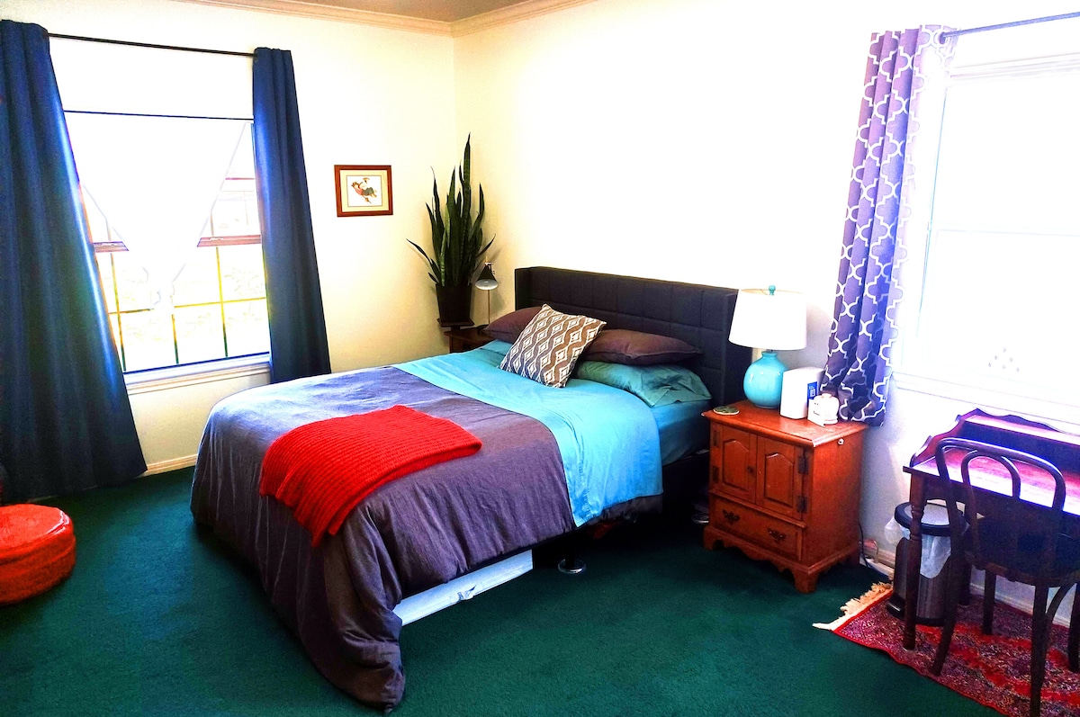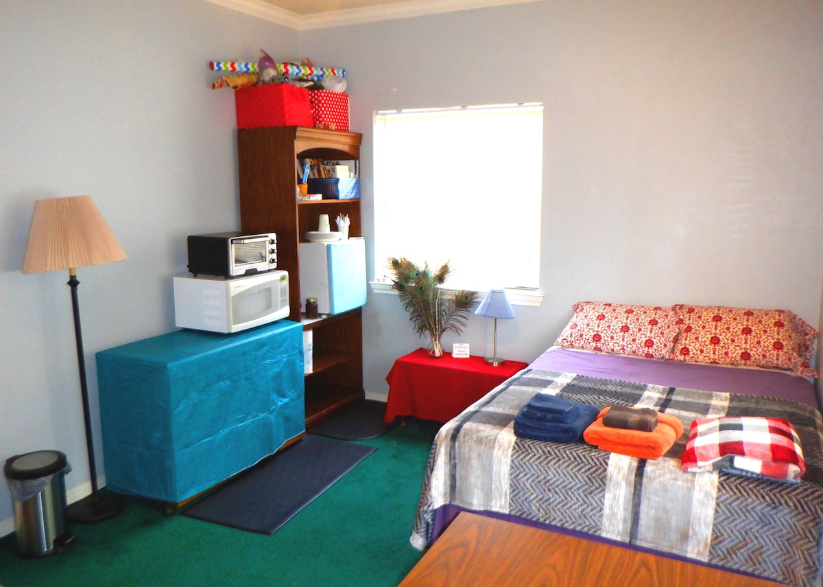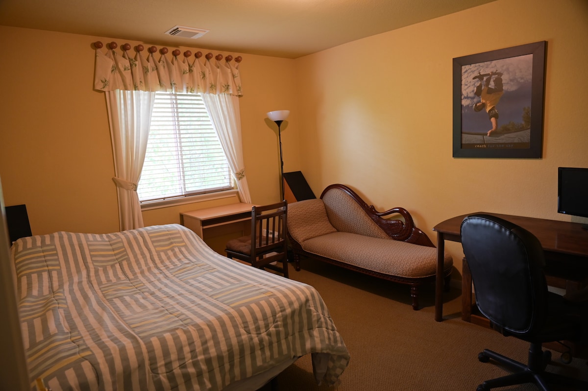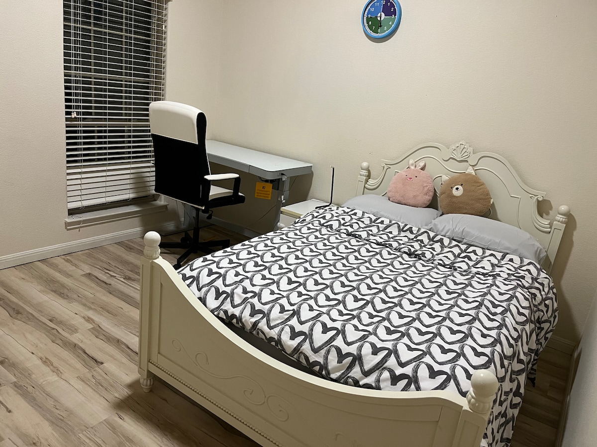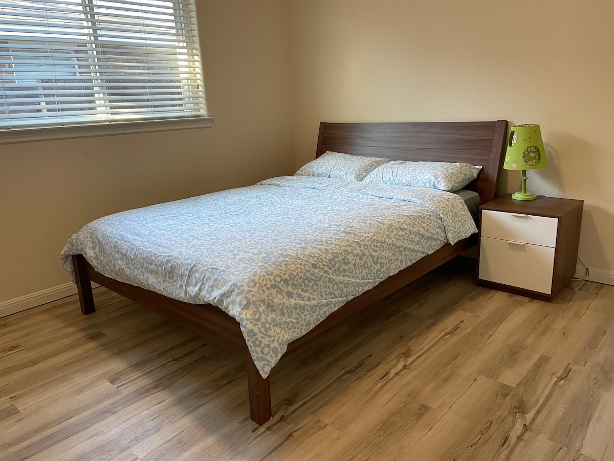 This is a very comfortable cozy room with wood floor, glass top desk, simple and clean, facing backyard. you can get plenty of sun if you open the blinds. It comes with full bath, bidet and all essentials. quiet and private.