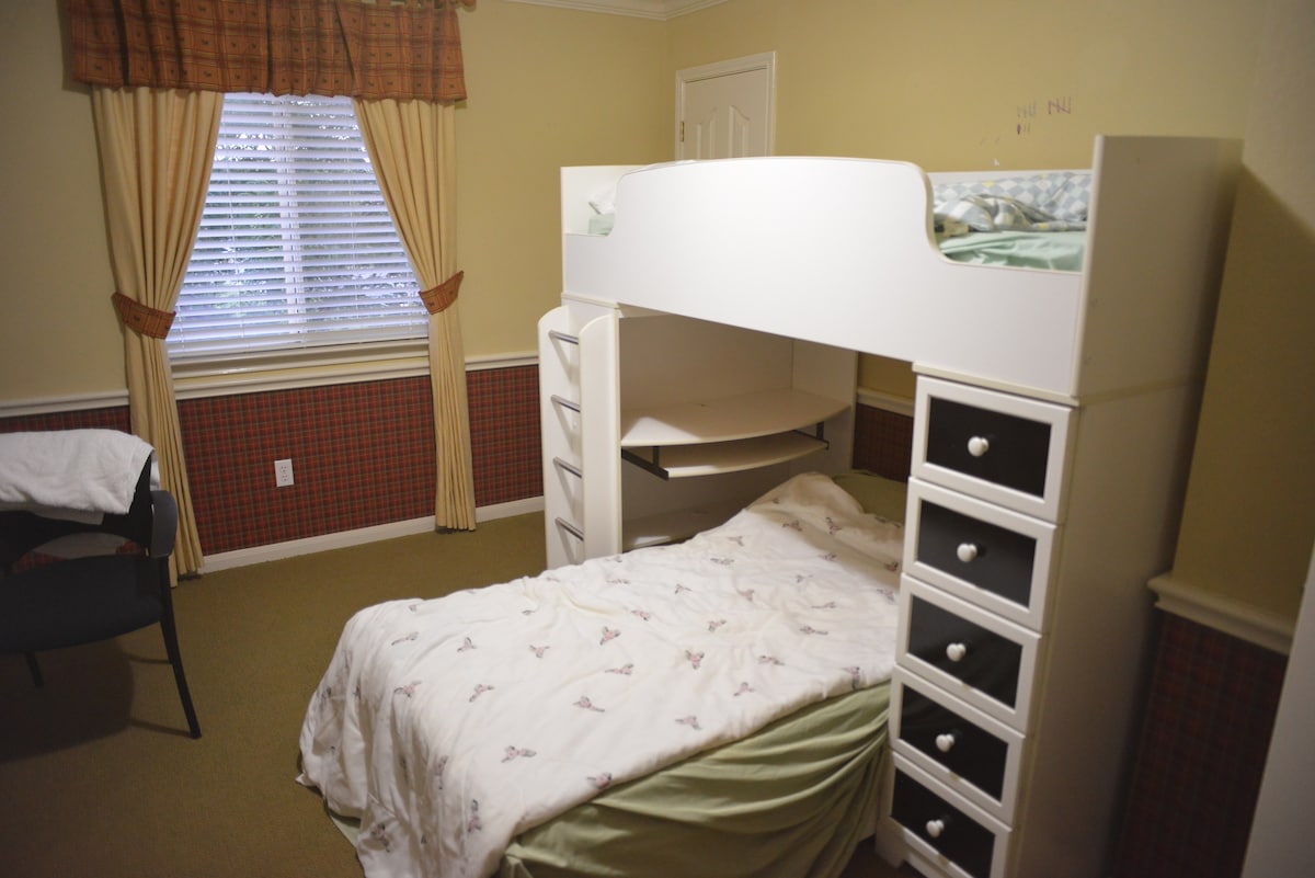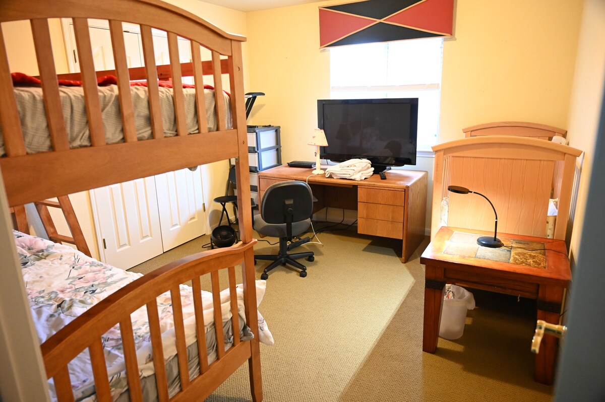 Dining and living room downstairs is at your leisure. Key code to front door is provided. Your room also has an electronic door lock set up for your easy and secure visit.