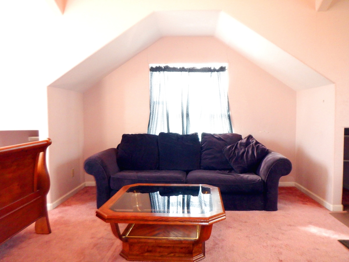 spacious room upstairs, lots of light, carpeted, with a big bathroom. u have a big living room with 52" big tv and comfortable couch just for you. its quiet, very clean with personal ac, fans. my AC can go as low as 78 between 12am to 8am since i have dry eye condition. other time u can have the temperature u want.