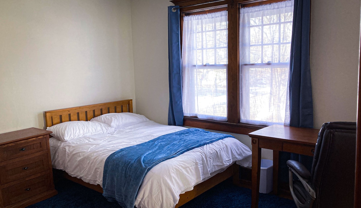 a mini-fridge, desk and chair, a small bit of hanging space alarm clock, pitcher and glassware for water. The 1.5 baths are shared among all guests and there is kitchen access as well. This room is generally available during busy weekends.