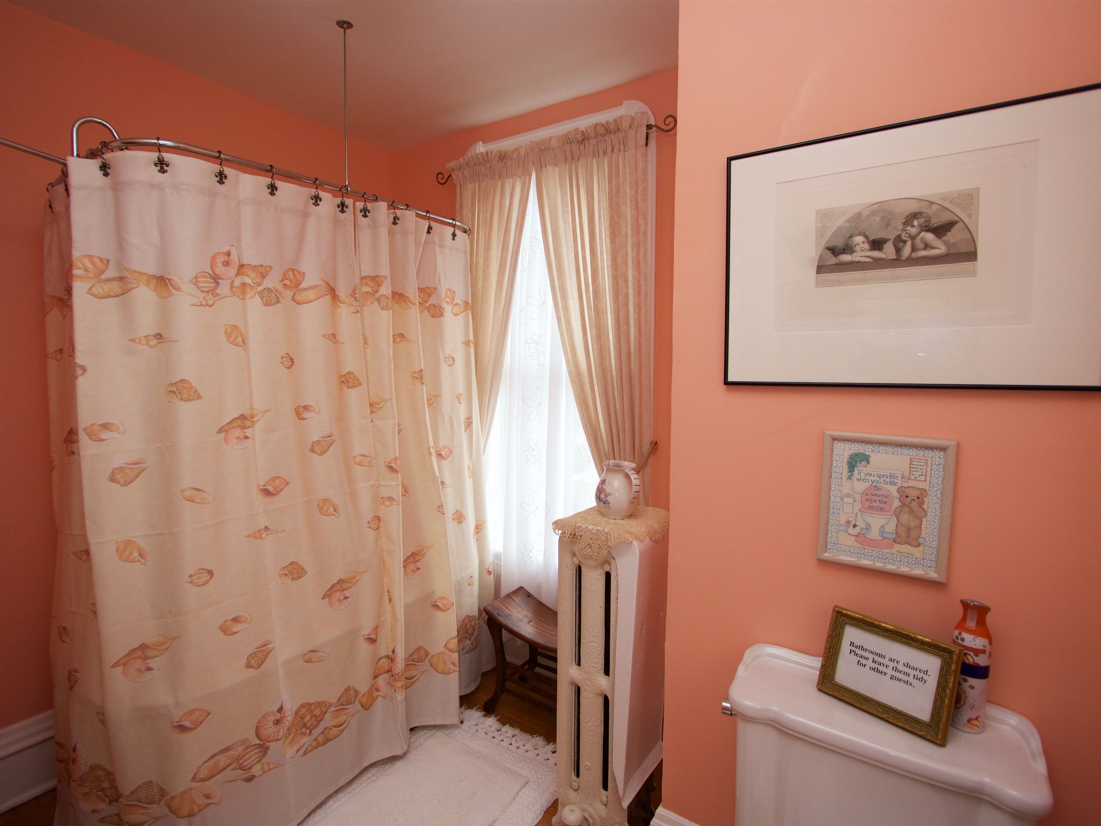 This booking is for one room with a shared bathroom. The Hearth Room has an old (nonfunctional) fireplace. It is directly to the left at the top of the double staircase.