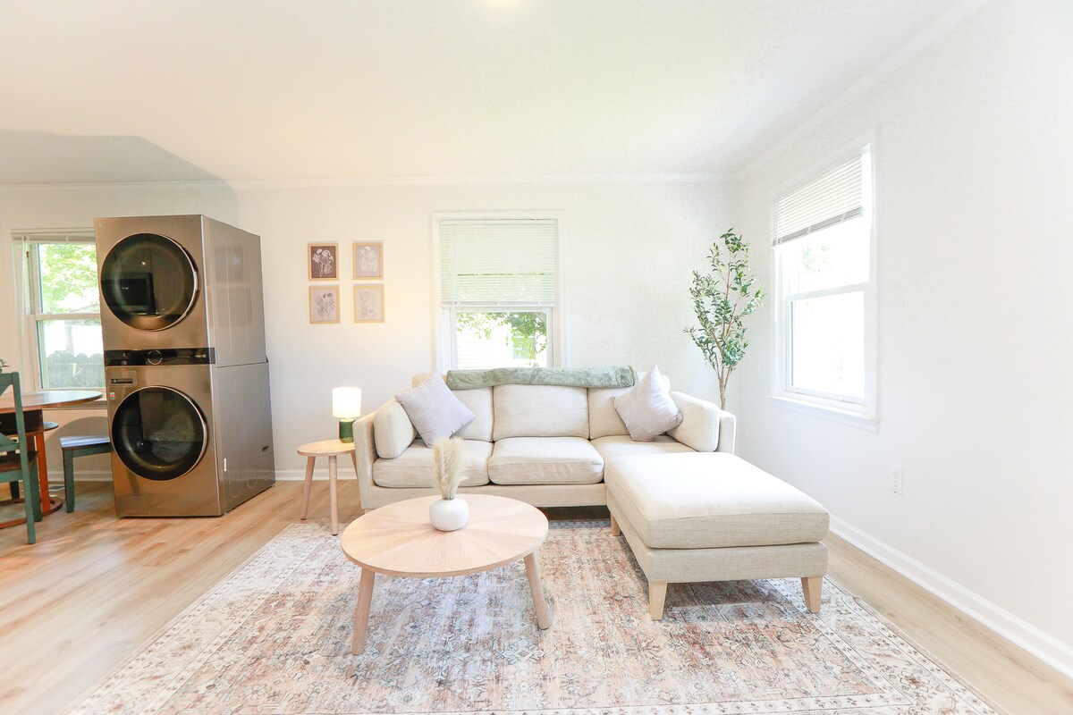Unwind at this peaceful & meticulously renovated/fully furnished studio suite in an extremely quiet neighborhood. Unit features; kitchenette, 1 king Size Bed, 1 Sleeper Sofa For 1 Extra Guest, 55 Inch Sony TV, Huge Walk-In Closet, Fridge, Over-The-Range Microwave, New Washer/Dryer, Glass Computer/Reading Desk, Free Street Parking... Bring Your Portable Cooking Appliances.