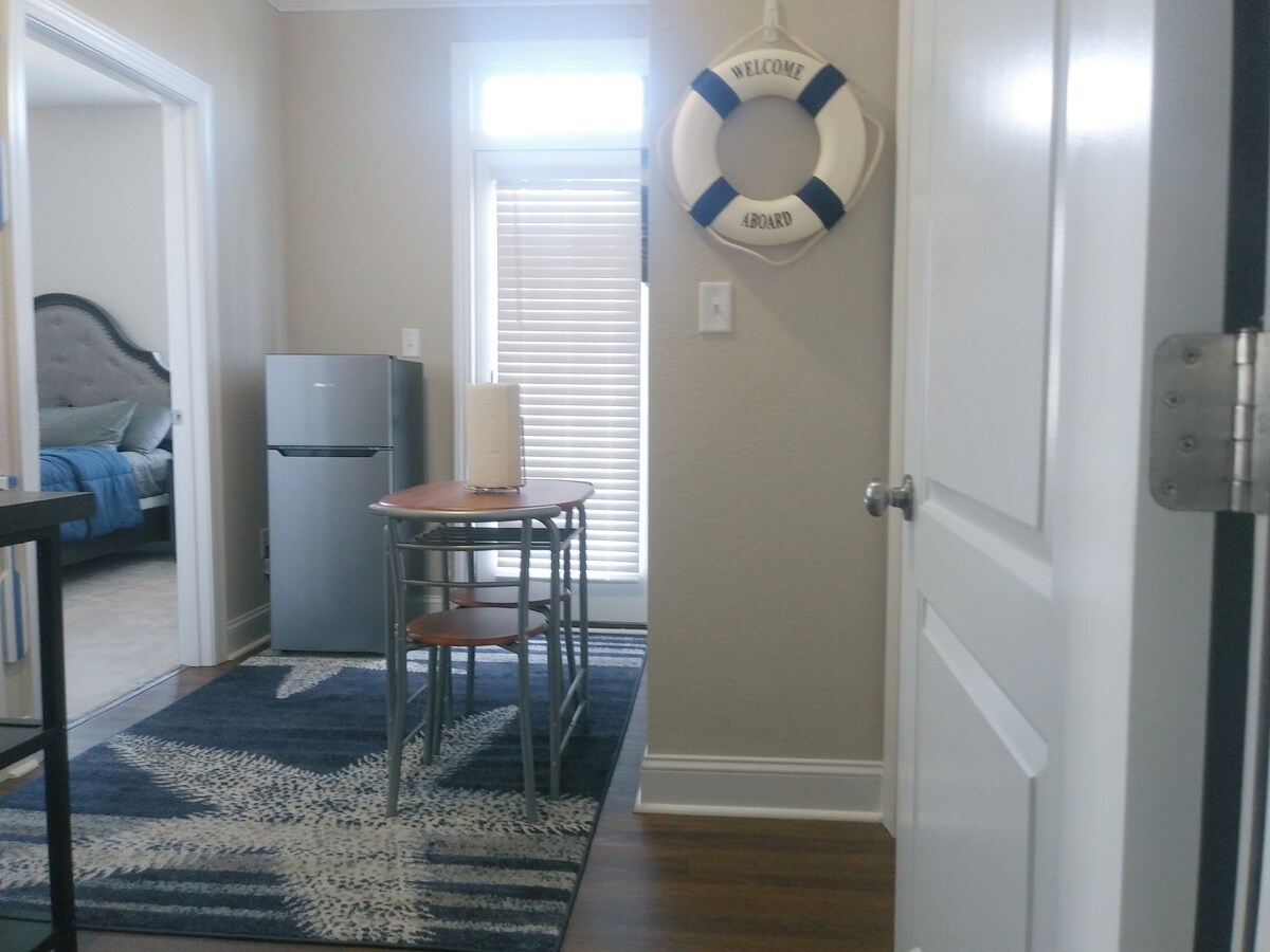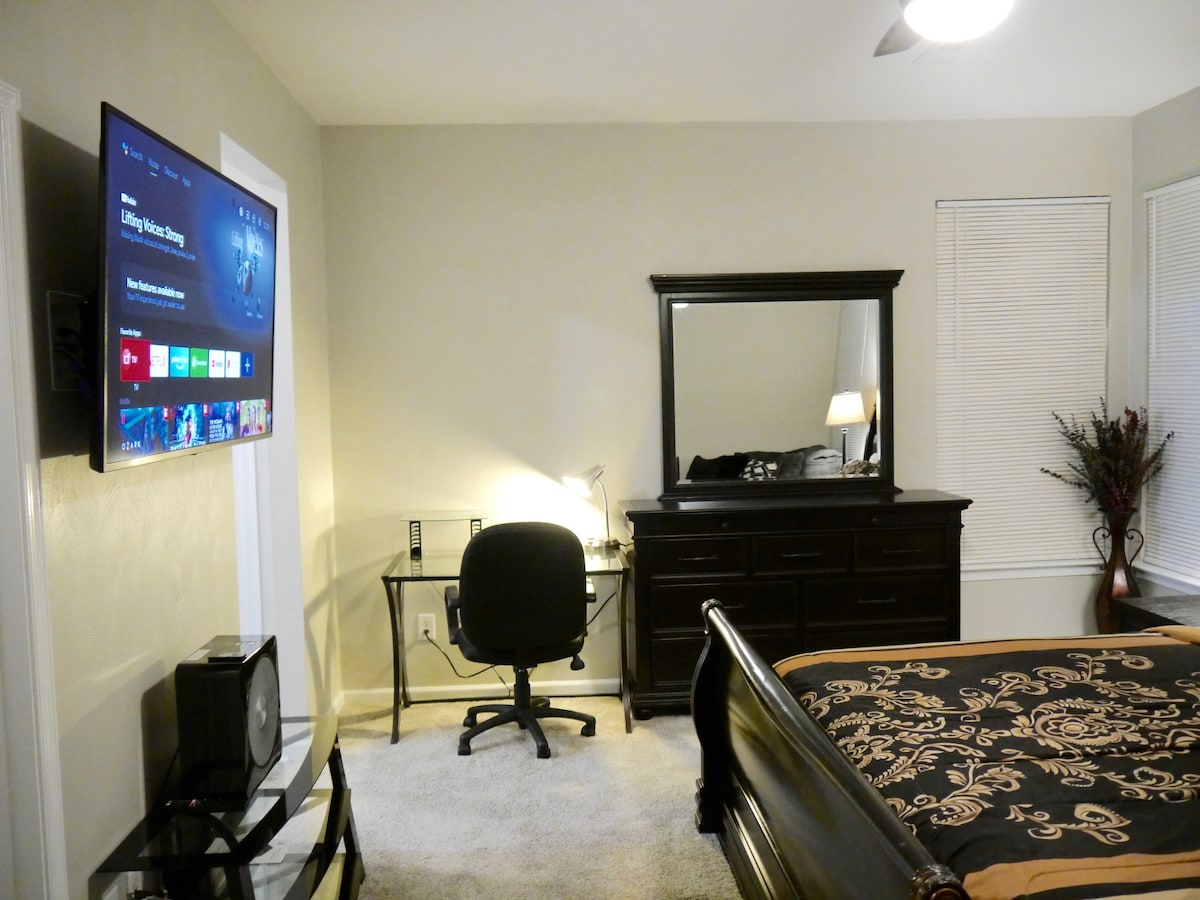 Come enjoy a great stay in this beautiful private In-law suite, located in the heart of Chesapeake where you can get lost in nature, peruse the fare at a farmer's market, or picnic on the water's edge with your family. Just minutes from surrounding Naval bases, Virginia Beach Oceanfront and Downtown Norfolk. All you have to do us gas-up and unplug. We'll take it from there. Reserve your stay today and let your moments begin! Enjoy your own private keyless entry getaway suite. This suite comes with a comfortable king size bed, kitchenette, small fridge, table for four, TV, leather futon and private bathroom.