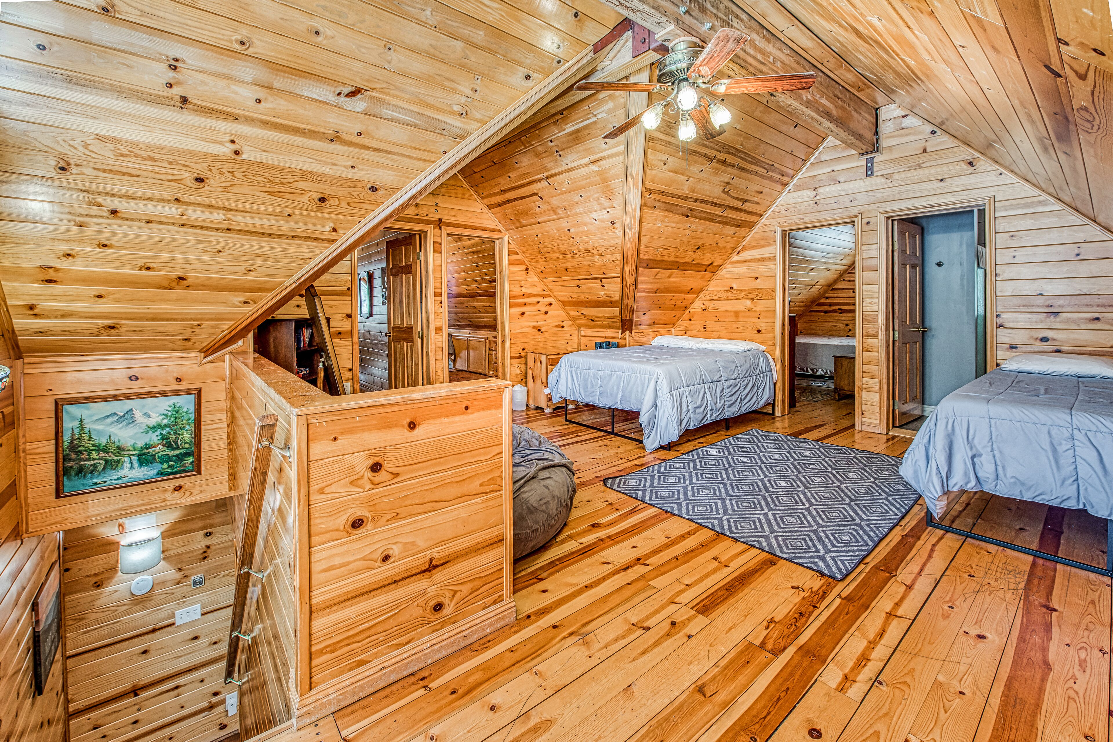 Upstairs, you'll find all three bedrooms with QUEEN size beds and a loft with two FULL size beds. Also, there's a bathroom upstairs with a toilet & shower.